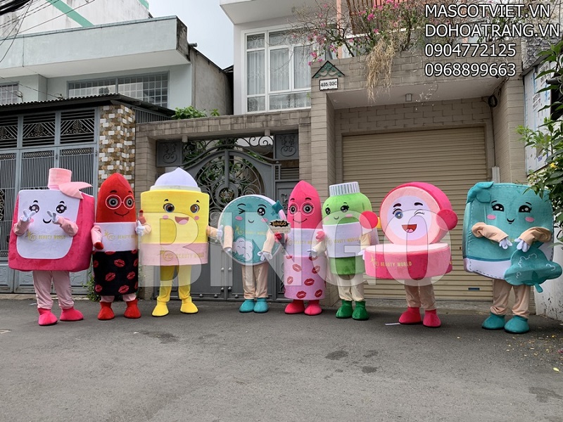 Mascot chai hộp mỹ phẩm Beauty World được sử dụng trong các buổi khai trương, phát triển của hàng mới của đơn vị. Đồng thời nếu dùng mascot tại các điểm bán hàng cũng rất phù hợp. Đây là điểm độc đáo, riêng có bởi mascot có thể check in, chụp ảnh cùng khách mua hàng cũng là cách giúp quảng bá và khiến mọi người biết tới nhiều hơn.