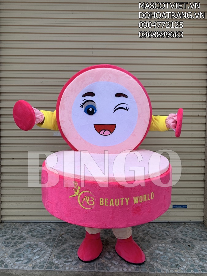 Mascot chai hộp mỹ phẩm Beauty World là mascot mô hình sản phẩm mô phỏng một hộp phấn của chị em phụ nữ. Phần bụng mascot phình to, hình trụ là hộp đựng phấn, phần bên trên là nắp mở, kết hợp với gương soi giúp chị em thuận tiện khi trang điểm.