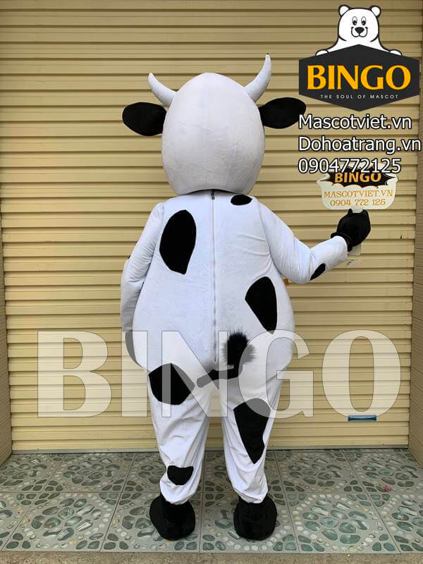 Trang phục mascot con bò 12 được BINGO sản xuất cho nhãn hàng Bingbox được BINGO lấy hình ảnh từ chú bò sữa với thân hình màu trắng kết hợp các mảng đen với nhau