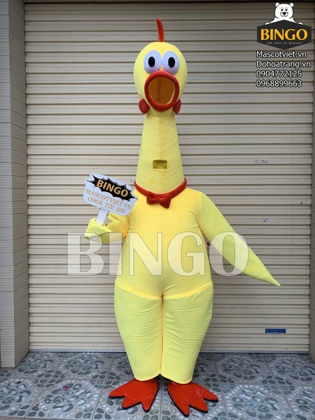- Mascot đặc tả hình ảnh chú gà đồ chơi có chiếc cổ dài và miệng há to như đang hét lớn