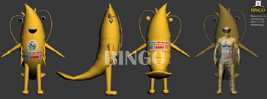 Mascot được may từ những chất liệu cao cấp, chuyện dụng như bông, mút, xốp, vải velbo, … phần thân tôm được tạo khung xốp nhẹ rỗng bên trong để cho người sử dụng có thể thoải mái trong thiết kế này mà không bị bí nóng hay quá nặng nề.