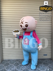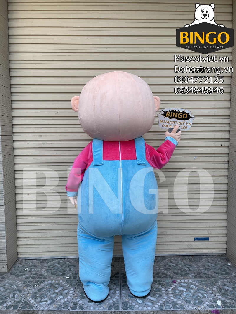 Mascot em bé Baby House có chiều cao khoảng 1,6m đến 1,8m mặc trang phục mùa đông với áo dài tay bằng vải bông màu đỏ có viền cổ tay màu xanh, da trời tông xuyệt tông với yếm liền chân cùng màu