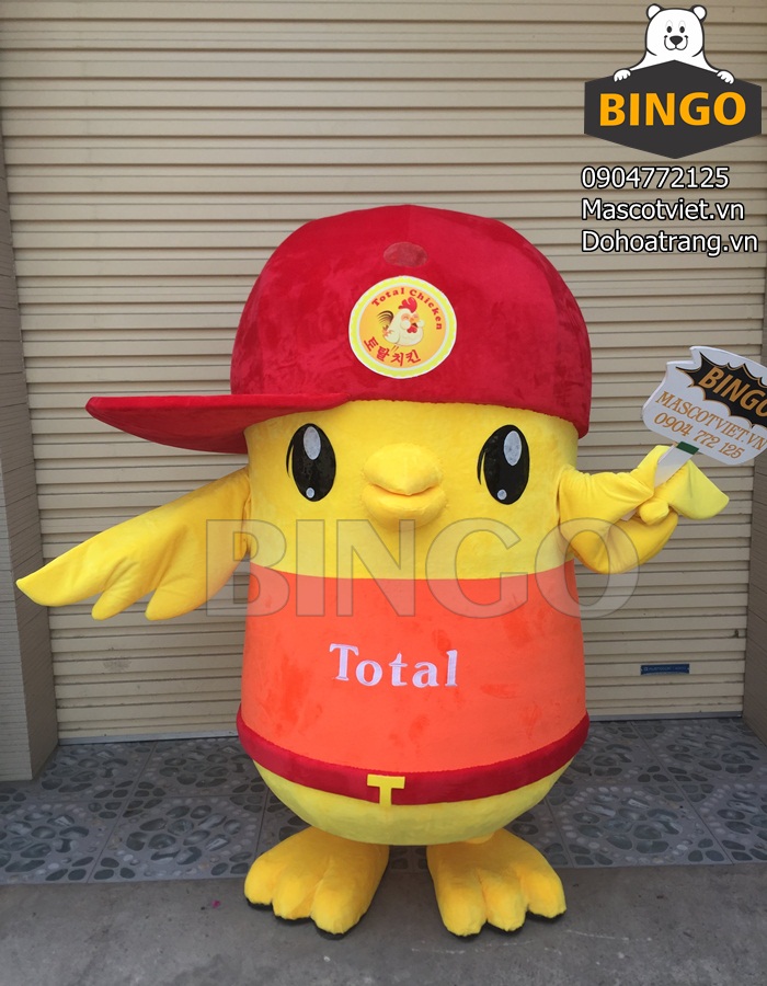 Những người yêu thích loài gia cầm nhỏ nhắn này sẽ lựa chọn mascot gà con Total và hoạt náo chơi trò chơi trong thời gian để tạo nên không khí vui vẻ gây ấn tượng với mọi người xung quanh.. Bộ trang phục này xuất hiện dưới dạng một bộ áo quần liền nhau với một kích cỡ chuẩn cho người lớn. Nó có một thân màu vàng với chữ Total. Bạn nhận được thêm phụ kiện nón kết đậm chất ngầu.
