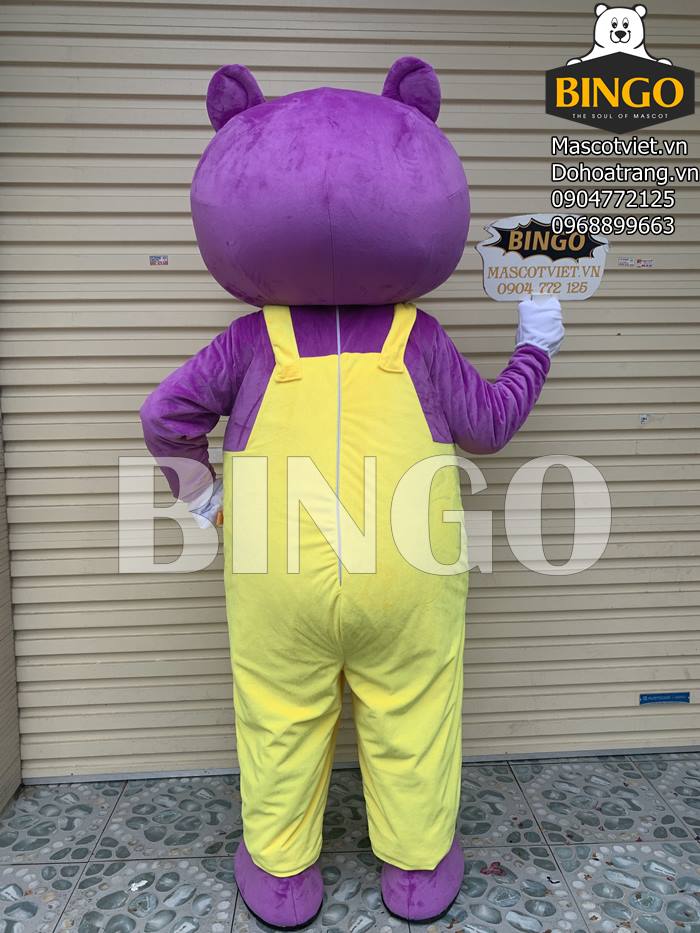 Thân hình mascot là màu tím đậm rất thu hút và bắt mắt. Chú gấu khoác trên mình bộ quần yếm màu vàng nổi bật. Hai sắc màu hòa kết hợp với nhau tạo sự hài hòa và ấn tượng cho tổng thể mascot.