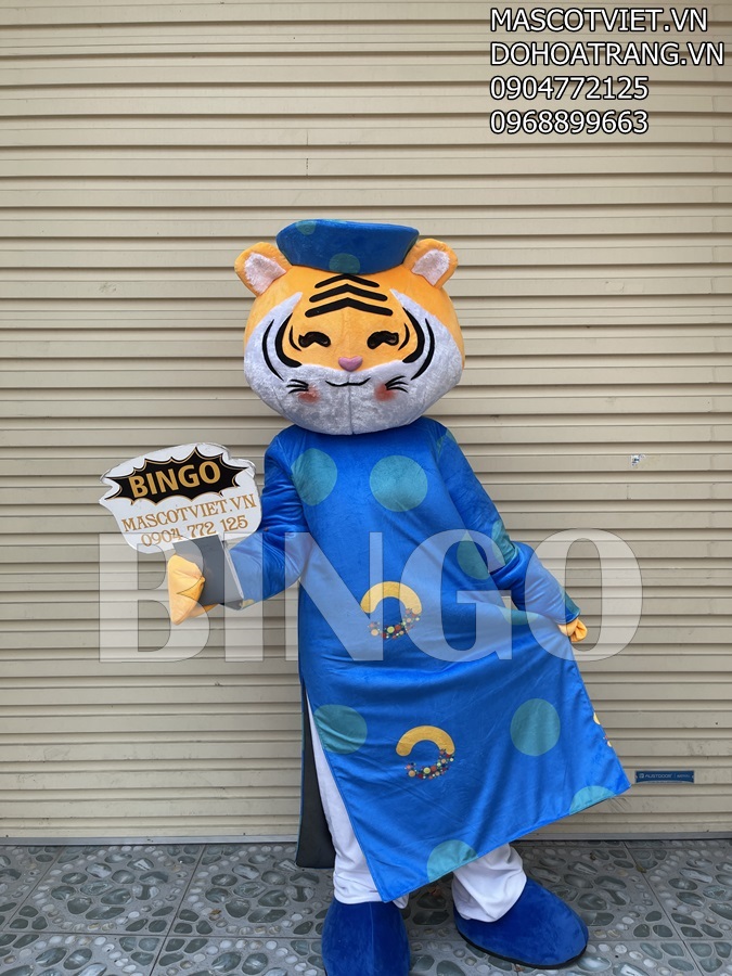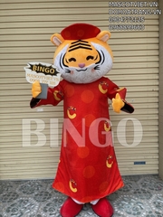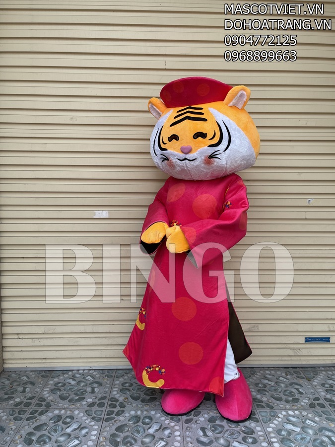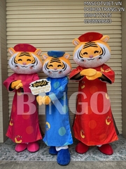 3 thành viên trong mascot gia đình cọp đều mặc trang phục áo dài truyền thống với sắc màu rực rỡ đó là màu đỏ , màu hồng và màu xanh. Hoa văn in trên các bộ trang phục tương tự nhau nên càng đẹp mắt. Những bộ trang phục này của mascot được may tương tự như những bộ cánh thông thường, nhưng được may rộng rãi tạo sự thoải mái và nhẹ nhàng cho người mặc. Không phải những chất liệu vải bông dày bí nóng là chất vải chuyên dụng tạo phom cứng cáp và bền màu.