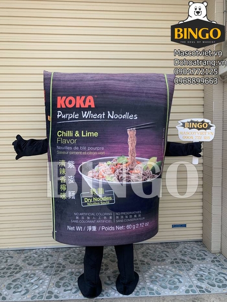 Mascot gói mì Koka sắc tím than lạ mắt, hình ảnh cực kỳ sinh động - Mascot Bingo. Chúng tôi là công ty chuyên về sản xuất mascot tại TPHCM, luôn mang đến những sản phẩm độc đáo, đặc sắc và thu hút nhất.