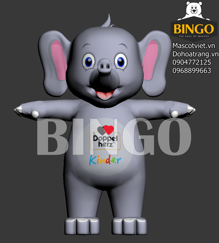 Mascot hơi voi Kinder được Bingo sản xuất theo yêu cầu, sản phẩm giống hoàn toàn so với bản thiết kế và được sản xuất một cách tỉ mĩ và kỹ lưỡng trong từng đường kim, mũi chỉ.