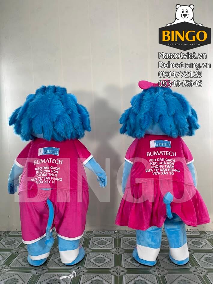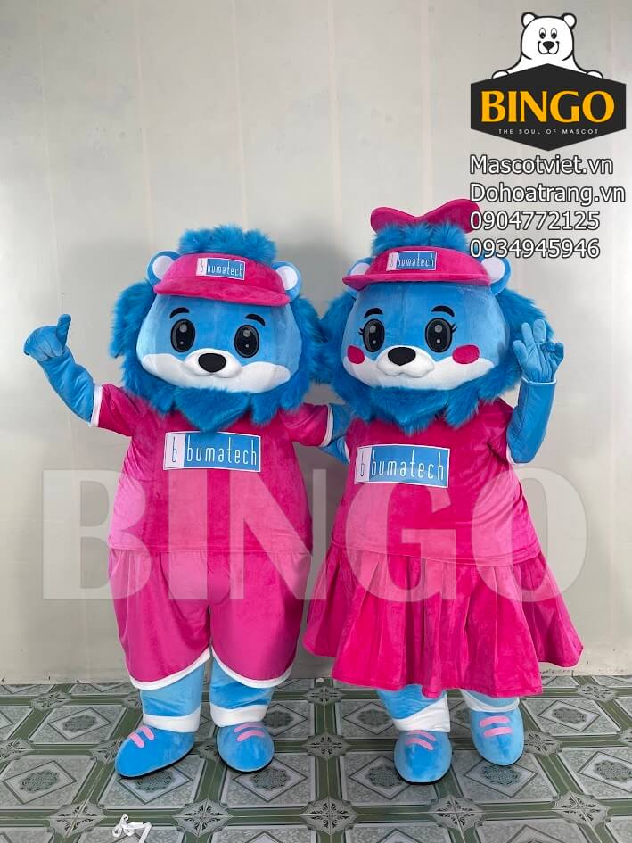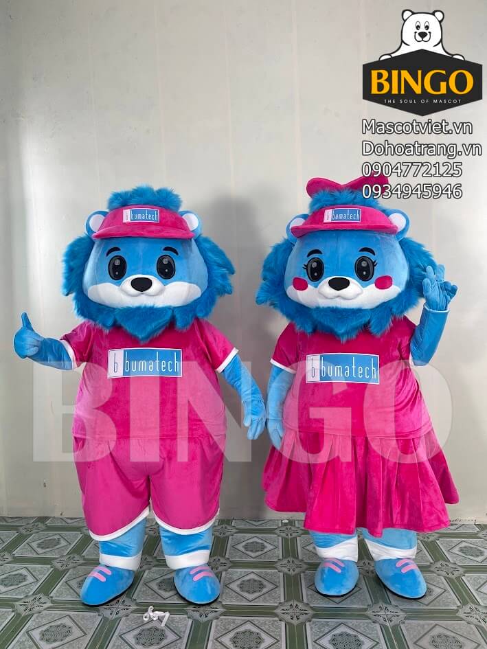 Mascot sư tử Bumatech được thiết kế độc đáo với màu xanh dương nổi bật kết hợp trang phục hồng rực rỡ, mang lại hình ảnh trẻ trung, hiện đại và dễ gây thiện cảm. Bộ mascot gồm phiên bản nam và nữ: sư tử nam mặc áo và quần thể thao khỏe khoắn, còn sư tử nữ diện váy hồng dịu dàng, tạo nên cặp đôi hài hòa và bắt mắt. Điểm nhấn là khuôn mặt sư tử đáng yêu với bờm xanh bông xù, đôi mắt to tròn cùng chiếc mũ hồng mang logo Bumatech, giúp hình ảnh thương hiệu được ghi nhớ dễ dàng.