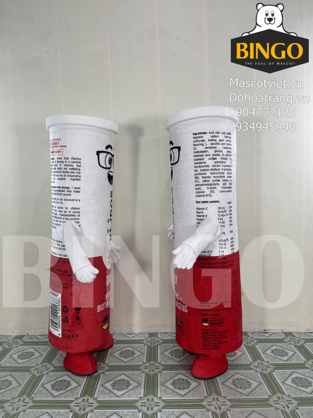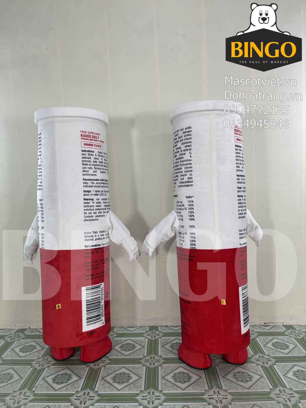 Mascot vitamin Kudos là mẫu mascot hơi độc đáo, được thiết kế mô phỏng hình dáng lọ vitamin thật với màu sắc trắng – đỏ nổi bật, in đầy đủ thông tin thương hiệu. Điểm nhấn ấn tượng chính là khuôn mặt hoạt hình vui nhộn với đôi mắt kính đen, nụ cười thân thiện giúp tạo cảm giác gần gũi, thu hút mọi ánh nhìn. Với phần tay linh hoạt và dáng đứng chắc chắn, mascot này không chỉ tái hiện sản phẩm một cách sống động mà còn mang lại sự vui vẻ cho các sự kiện.