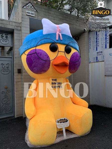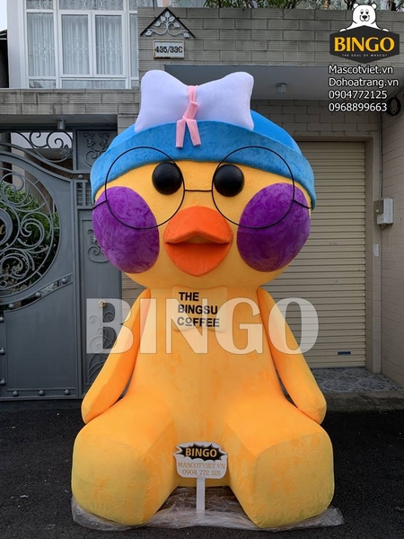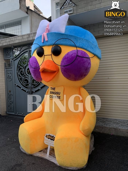 - Chú vịt vàng ở tư thế ngồi, phía trước cổ có dòng chữ The Bingsu Coffee, có thể sử dụng được cho quán cafe cùng nhiều không gian khác nhau như trung tâm mua sắm, trung tâm thương mại...