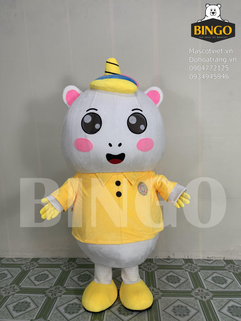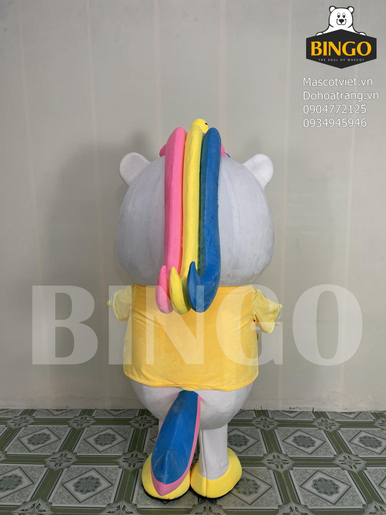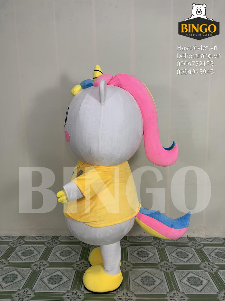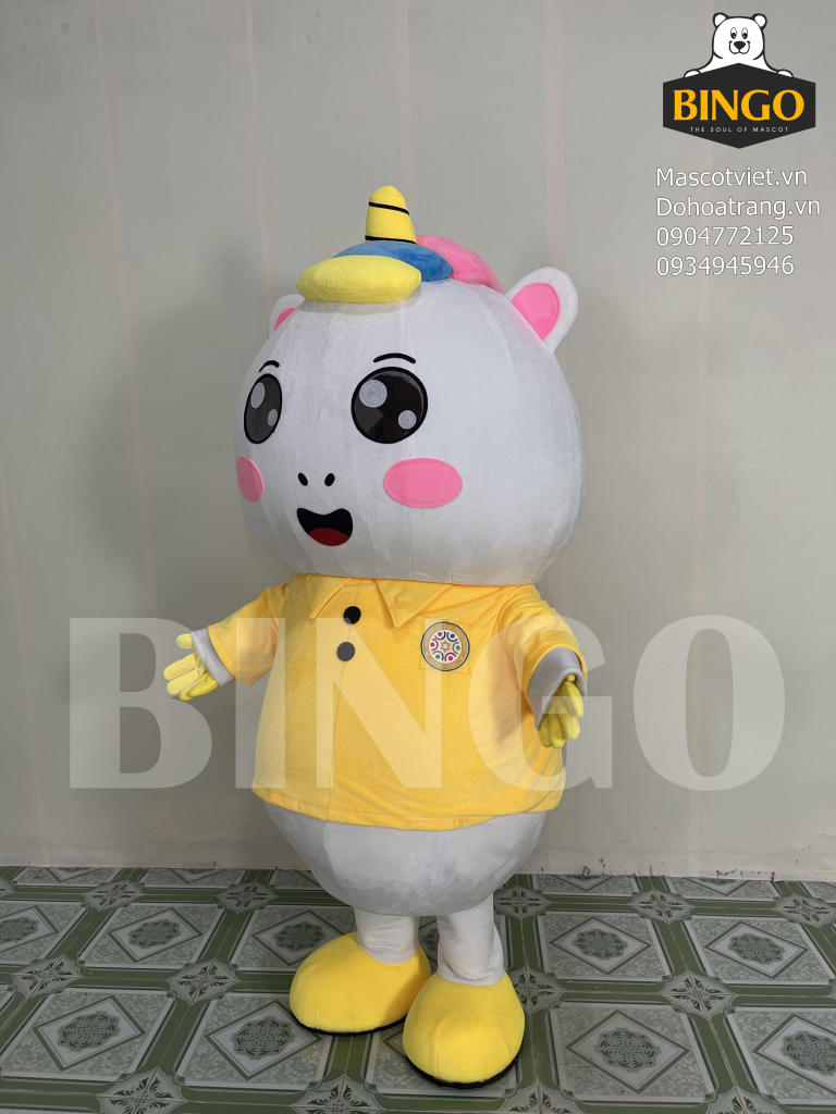 Mascot kỳ lân trắng đáng yêu này nổi bật với chiếc sừng vàng rực rỡ, bờm hồng xanh nổi bật và chiếc áo khoác vàng tươi vui. Khuôn mặt tròn xoe, đôi mắt long lanh và má hồng khiến ai cũng muốn ôm. Thích hợp cho sự kiện thiếu nhi, trường mầm non, trung tâm thương mại.