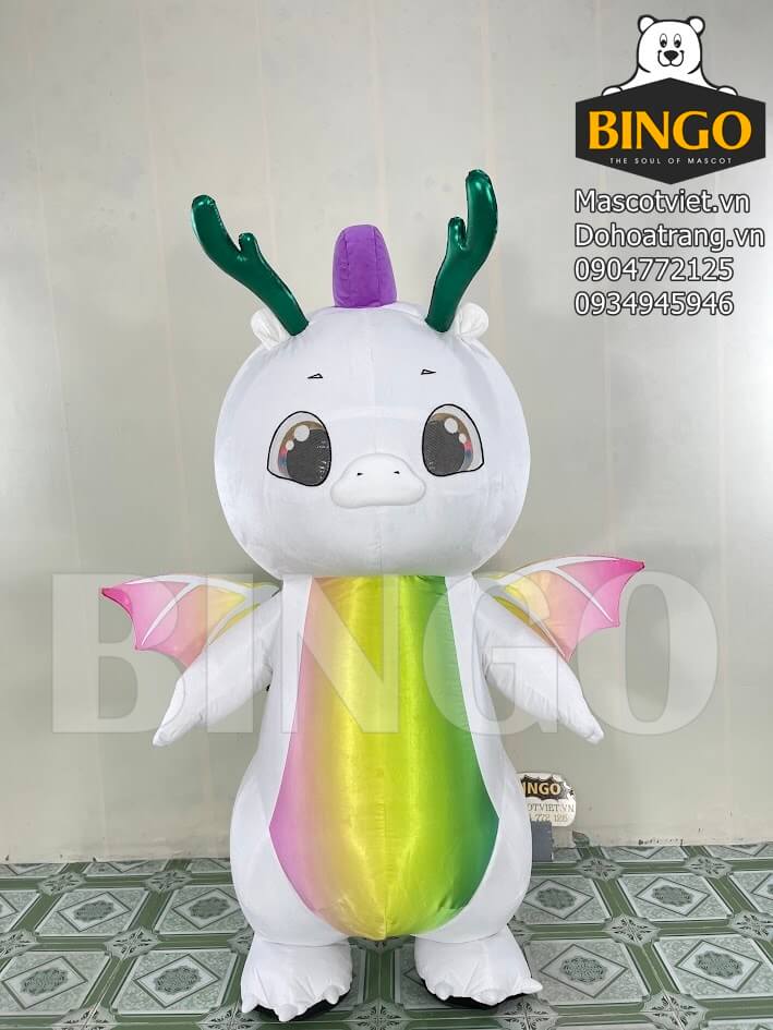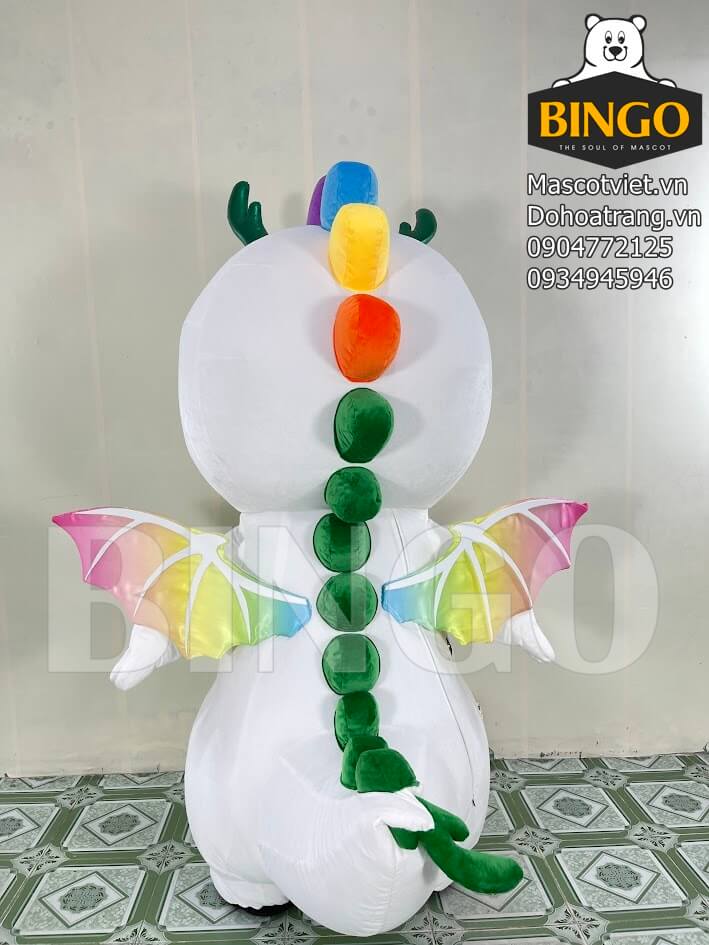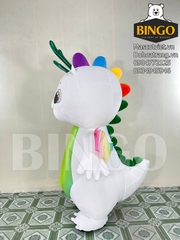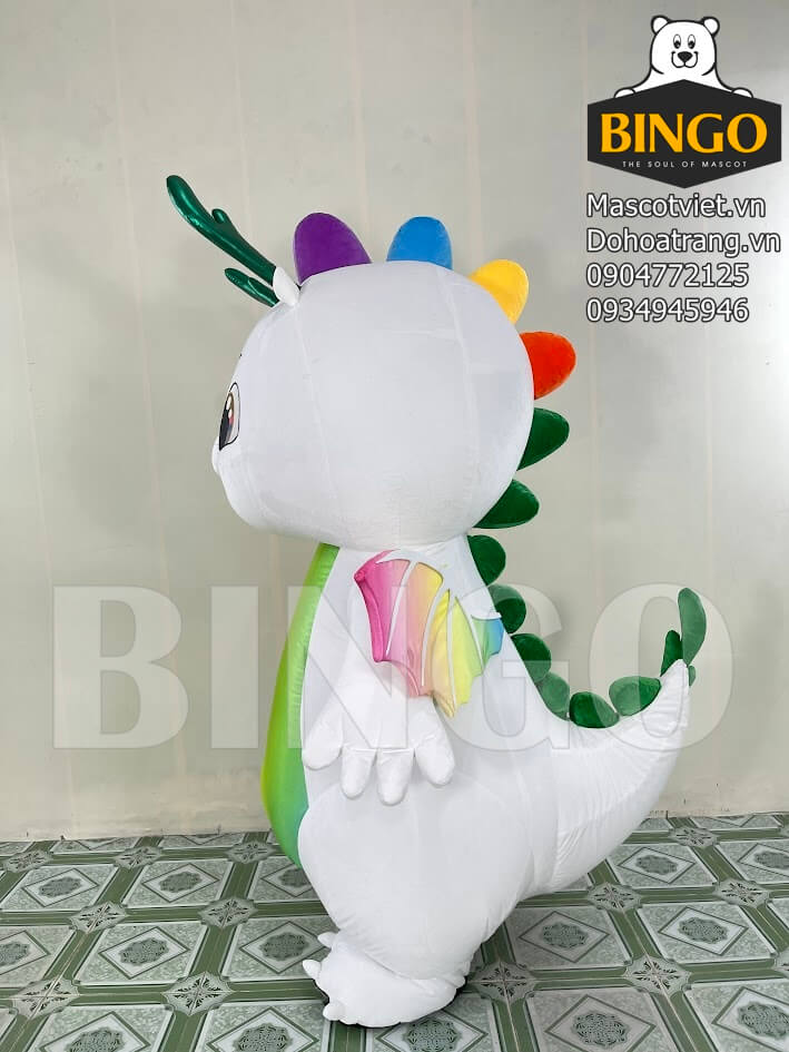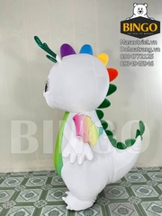 Mascot hơi rồng linh vật của Trung tâm thương mại PARC MALL là thiết kế mascot hơi độc đáo, gây ấn tượng mạnh ngay từ cái nhìn đầu tiên nhờ sự kết hợp tinh tế giữa màu sắc và tạo hình. Thân rồng trắng tinh khôi làm nền hoàn hảo để nổi bật phần bụng in chuyển màu gradient xanh lá – vàng – hồng, mang lại hiệu ứng lung linh, rực rỡ như cầu vồng. Đôi cánh nhỏ xinh hai bên phối pastel hồng – vàng – xanh gợi cảm giác huyền ảo, như chú rồng bước ra từ câu chuyện cổ tích. Phần đầu to tròn với đôi mắt cartoon long lanh, ánh sáng phản chiếu khiến linh vật trở nên ngộ nghĩnh và gần gũi. Sừng xanh lá ánh kim và dãy gai lưng đa sắc (tím – xanh – vàng – đỏ – xanh lá) chạy dọc từ đỉnh đầu đến tận đuôi tạo nên sự sinh động, vui nhộn. Đuôi nhỏ xinh cùng bàn chân mũm mĩm góp phần làm tổng thể thêm hài hòa, dễ thương. Đây là điểm nhấn hoàn hảo cho PARC MALL, phù hợp xuất hiện tại các sự kiện thiếu nhi, lễ hội, hoạt động giải trí hay chương trình quảng bá thương hiệu, giúp thu hút mọi ánh nhìn và tạo nên bầu không khí sôi động.