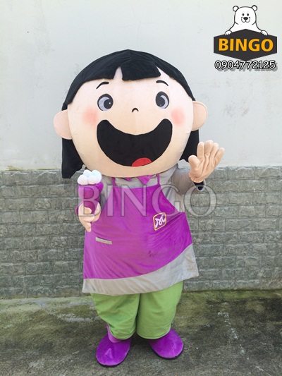 Mascot cô bé với khuôn mặt đáng yêu, nụ cười tươi tắn cùng với trang phục dễ thương này sẽ làm xao xuyến lòng người đối diện khi xuất hiện. Phụ kiện đi kèm là cây kem nhỏ trên tay, làm tăng thêm mức độ nhí nhảnh và sinh động hơn. Quý khách có thể sử dụng trang phục này diễn kịch, cổ động ở các khu vui chơi trẻ nhỏ...