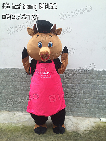 Mascot con bò khi xuất hiện chắc hẳn sẽ khiến mọi người xung quanh phấn khích bởi độ thiết kế thật đến từng chi tiết của trang phục. Một lớp vải lông nâu mềm, 02 chiếc sừng nhỏ, 01 cái vòng mũi và nổi bật bởi tạp - dề hồng neon.