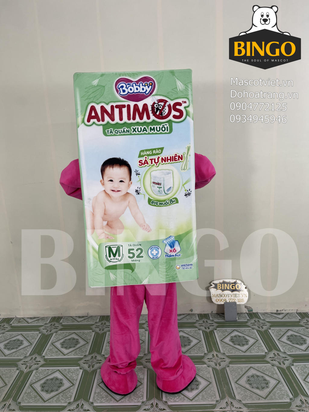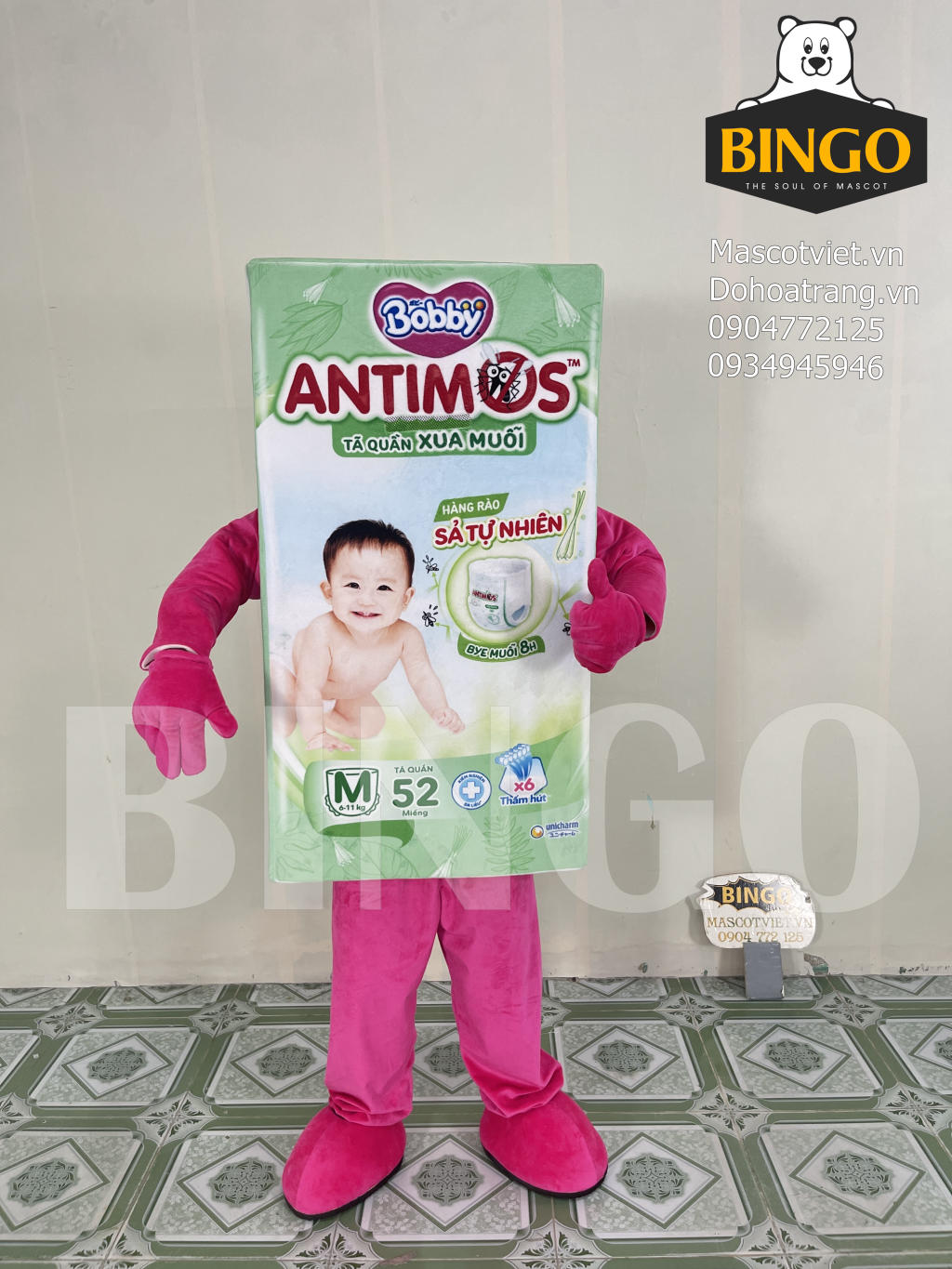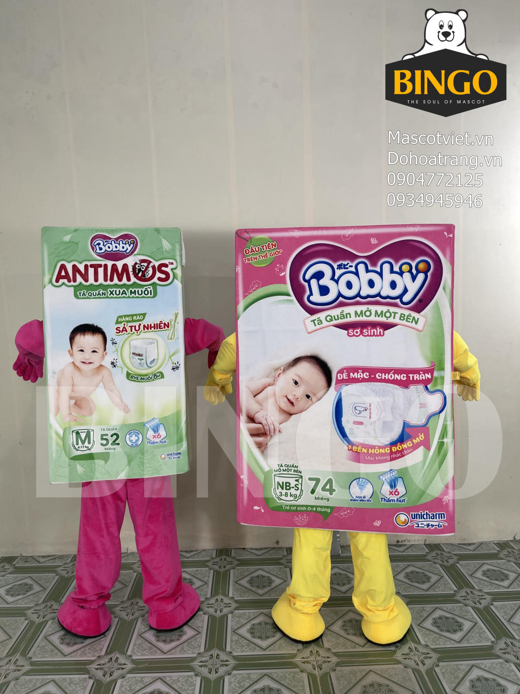 Mascot bịch tã Bobby là thiết kế quảng cáo sống động và đáng yêu, mô phỏng chính xác bao bì sản phẩm thực tế của thương hiệu tã nổi tiếng. Với hai phiên bản: Bobby Antimos (xua muỗi) màu xanh lá và Bobby sơ sinh màu hồng, mỗi mascot đều được thể hiện chi tiết hình ảnh, logo, tính năng và thiết kế đặc trưng trên bề mặt, tạo nên hiệu ứng nhận diện thương hiệu mạnh mẽ. Phần thân mascot là lớp vải nhung mềm mại, màu sắc tươi sáng như hồng và vàng, giúp thu hút sự chú ý tại các sự kiện, hội chợ, chương trình ra mắt sản phẩm hay khuyến mãi.