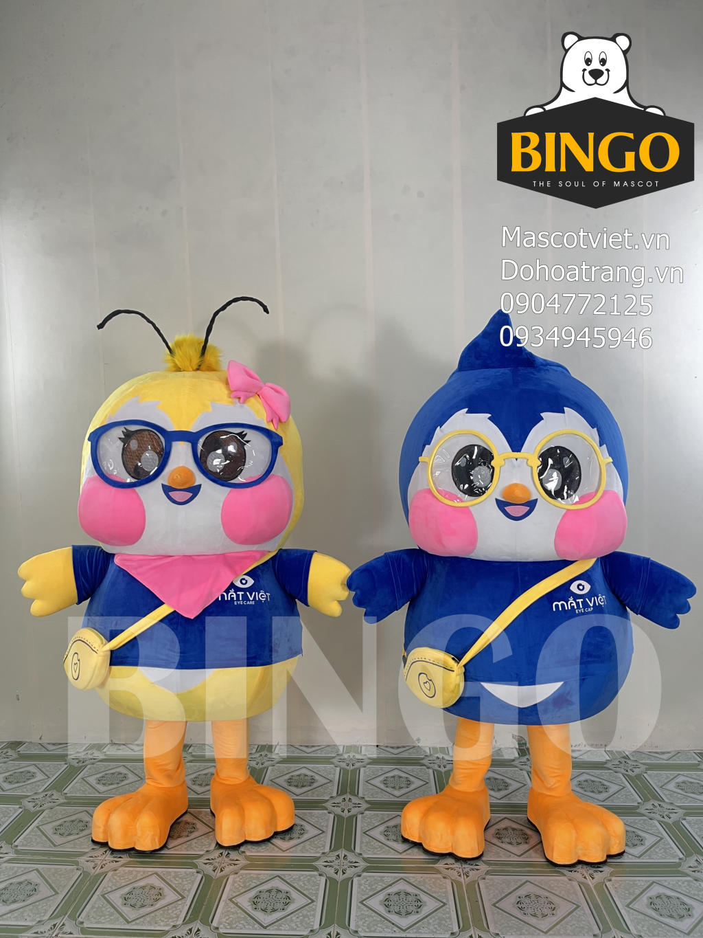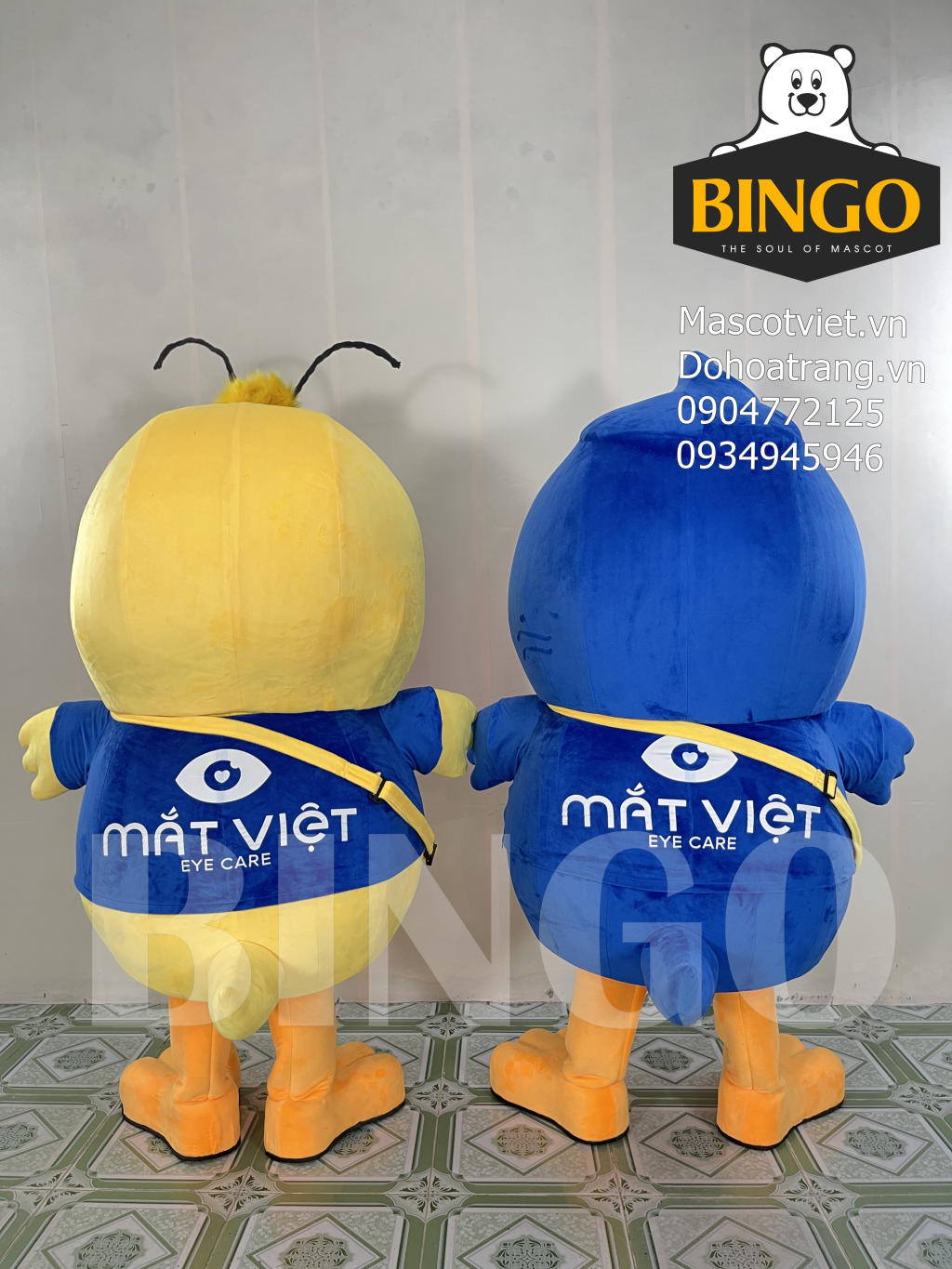 Mascot chim vàng khuyên Mắt Việt là thiết kế độc quyền do BINGO sản xuất, mang phong cách đáng yêu và nổi bật. Bộ mascot gồm hai chú chim xanh – vàng, tạo hình dễ thương với đôi mắt to, má hồng và phụ kiện kính, túi chéo thời trang. Đây là hình ảnh đại diện sinh động, giúp thương hiệu Mắt Việt Eye Care trở nên gần gũi, thu hút khách hàng ở mọi lứa tuổi.