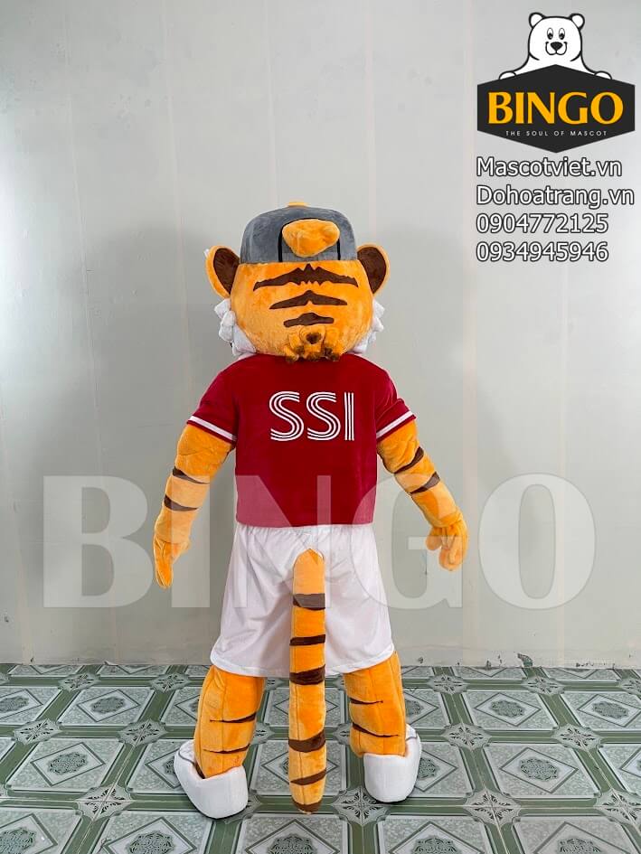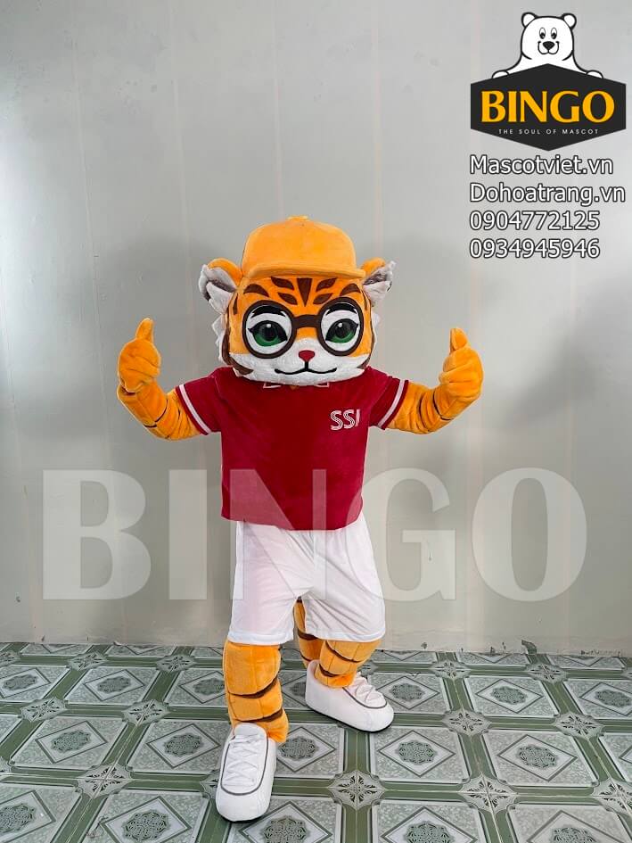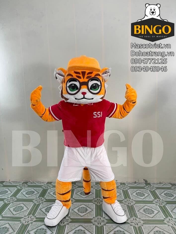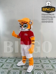 Mascot cọp SSI là mẫu thiết kế mascot nổi bật với tạo hình chú hổ hiện đại và năng động. Nhân vật có bộ lông cam sọc đen đặc trưng, gương mặt thân thiện với đôi mắt to tròn, đeo kính sành điệu và chiếc mũ lưỡi trai cá tính. Trang phục gồm áo thun đỏ in logo “SSI” và quần trắng thể thao, mang đậm phong cách trẻ trung, hiện đại. Thiết kế dáng đứng chắc khỏe cùng các chi tiết như tai, đuôi và bàn tay được làm tỉ mỉ, tạo nên tổng thể hài hòa và bắt mắt.