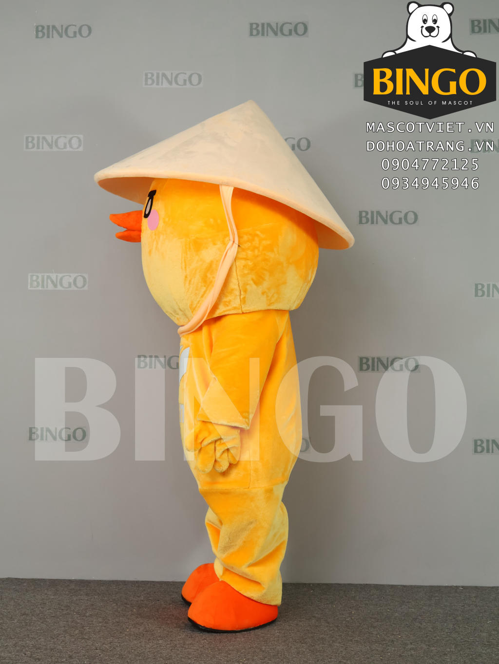 Màu sắc nhận diện: Mascot giữ trọn tông màu vàng- cam đặc trưng, in logo trước ngực giúp tăng cường khả năng nhận diện thương hiệu mạnh mẽ trong các sự kiện khai trương hay hoạt náo.