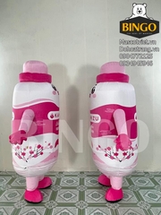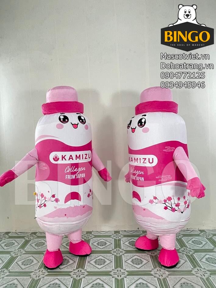 Mascot hơi chai Kamizu được thiết kế mô phỏng sản phẩm collagen đến từ Nhật Bản, mang phong cách dễ thương và nổi bật. Với tạo hình chai tròn phồng đáng yêu, mascot sử dụng tông hồng chủ đạo kết hợp các họa tiết hoa anh đào và núi Phú Sĩ, gợi liên tưởng rõ rệt đến văn hóa Nhật. Gương mặt mascot được in sắc nét với đôi mắt to tròn, má hồng và nụ cười thân thiện, tạo cảm giác gần gũi và dễ mến. Phần đầu được cách điệu thành nắp chai với tông hồng nổi bật, tăng thêm phần sinh động cho tổng thể.
