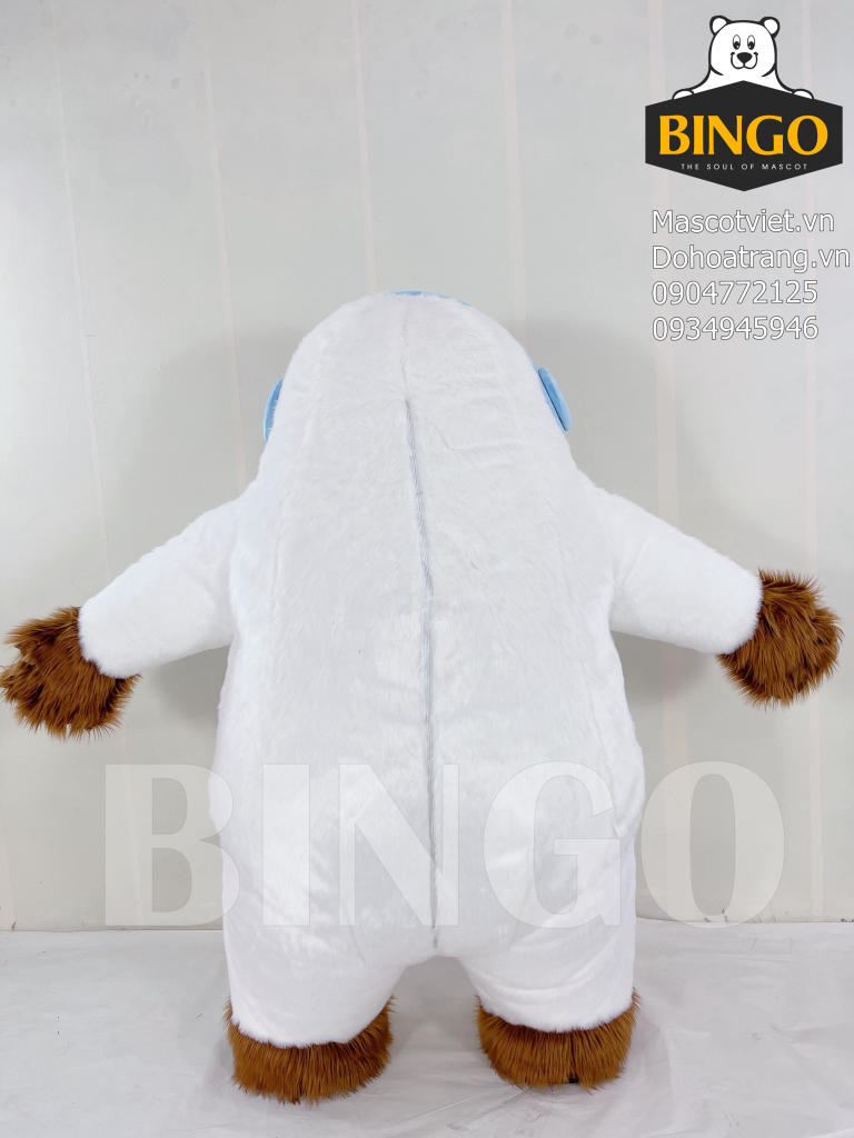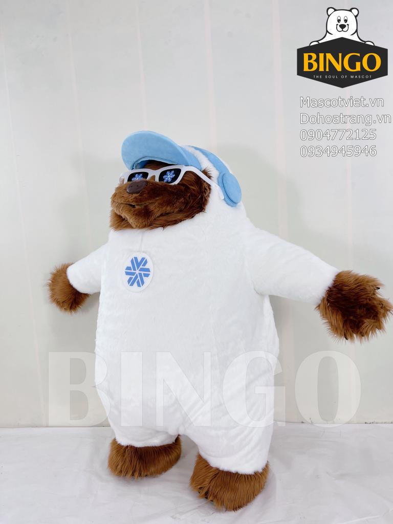 Mascot hơi gấu Ticket gây ấn tượng mạnh với bộ lông nâu mềm mại, khoác lên người bộ trang phục trắng nổi bật cùng logo xanh sang trọng trên ngực. Điểm nhấn chính là chiếc mũ lưỡi trai xanh tươi trẻ và kính mát họa tiết bông tuyết, tạo phong cách năng động, hiện đại.chân tay lông xù làm mascot càng thêm đáng yêu, gần gũi.