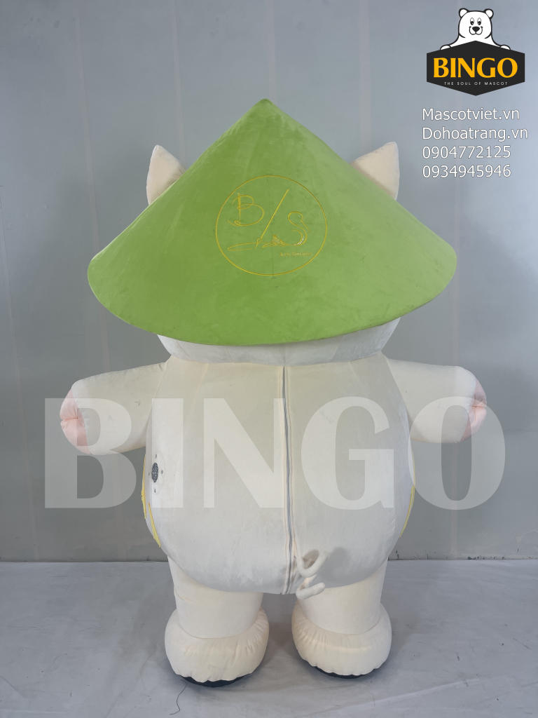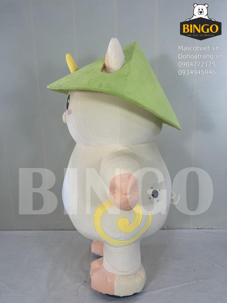 Mascot hơi Heo Pigmoon nổi bật với tạo hình ngộ nghĩnh, đáng yêu và thân thiện. Nhân vật được thiết kế theo hình tượng chú heo mũm mĩm, thân trắng sữa, bụng tròn bầu bĩnh và hai má hồng dễ thương. Đặc biệt, Pigmom đội chiếc nón lá màu xanh lá,kết hợp thêm hình mặt trăng khuyết đặt trên nón.Gương mặt Pigmoon toát lên sự vui tươi với đôi mắt tròn long lanh, mũi heo đặc trưng và nụ cười tươi tắn. Hai bên thân có họa tiết xoắn vàng nổi bật, giúp tăng độ nhận diện khi biểu diễn hoặc chụp ảnh. Đây là mẫu mascot hơi nhẹ, dễ mặc và vận hành.