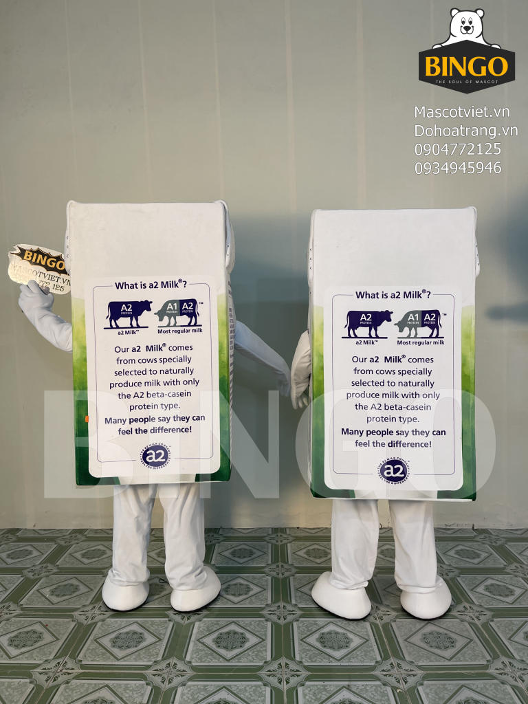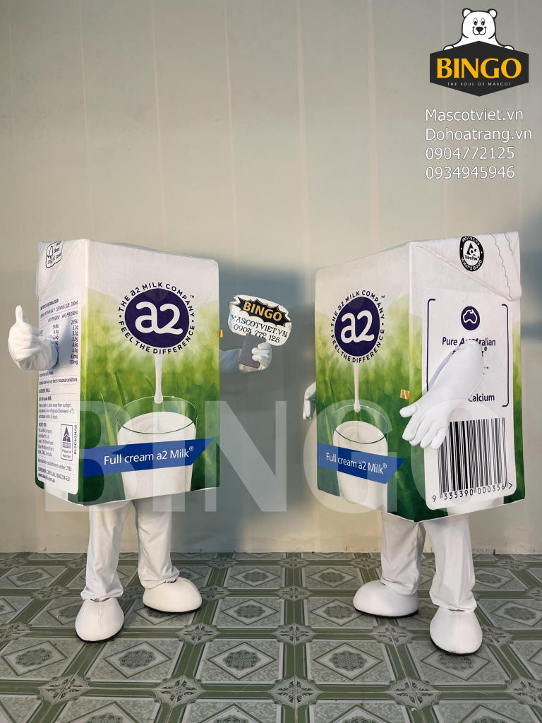 • Mascot được tạo hình giống hệt hộp sữa thật của thương hiệu a2, với tông màu chủ đạo trắng – xanh lá cây – xanh dương.