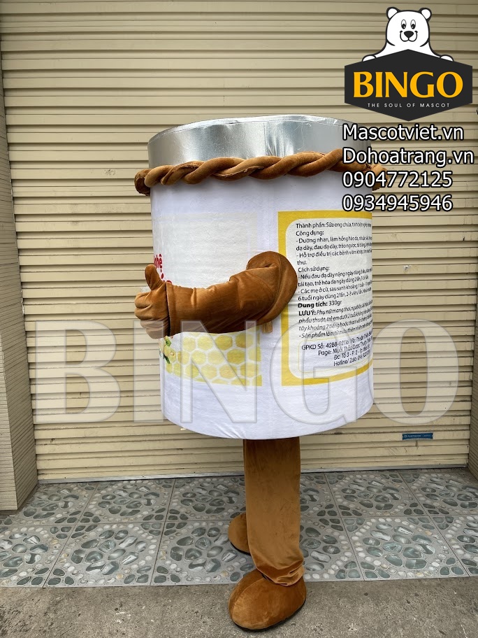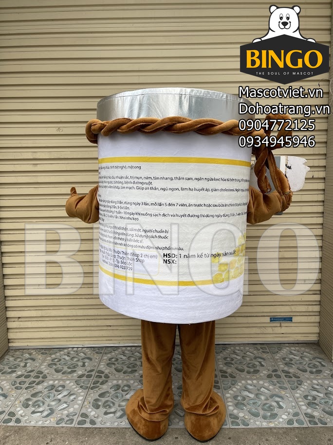 Mascot hũ viên tinh nghệ được trang bị đầy đủ các bộ phận của một hũ đựng trên thực tế với nắp, thân hũ, dây buộc miệng hũ… đặc biệt, để sản phẩm trở nên sinh động hơn, thân thiện hơn, Nhà sản xuất còn khéo léo trang bị thêm đôi tay với các ngón linh hoạt và đôi chân, thuận tiện cho việc di chuyển.
