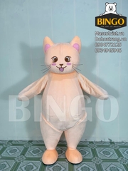 Mascot mèo áo choàng được thiết kế với tạo hình dễ thương và nổi bật. Phần thân mèo màu da, khuôn mặt bầu bĩnh với đôi mắt tròn, mũi nhỏ và ria mép dài, toát lên vẻ đáng yêu, thân thiện.