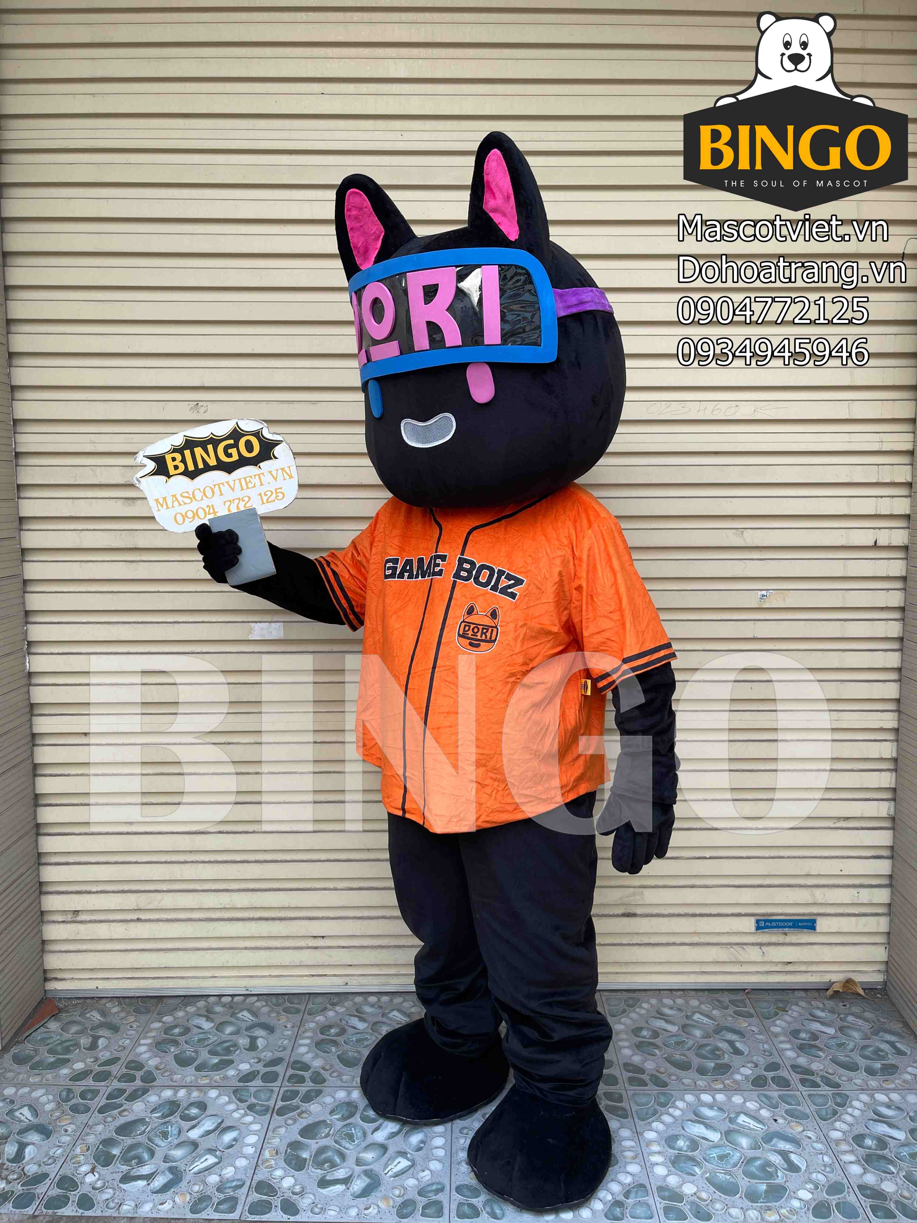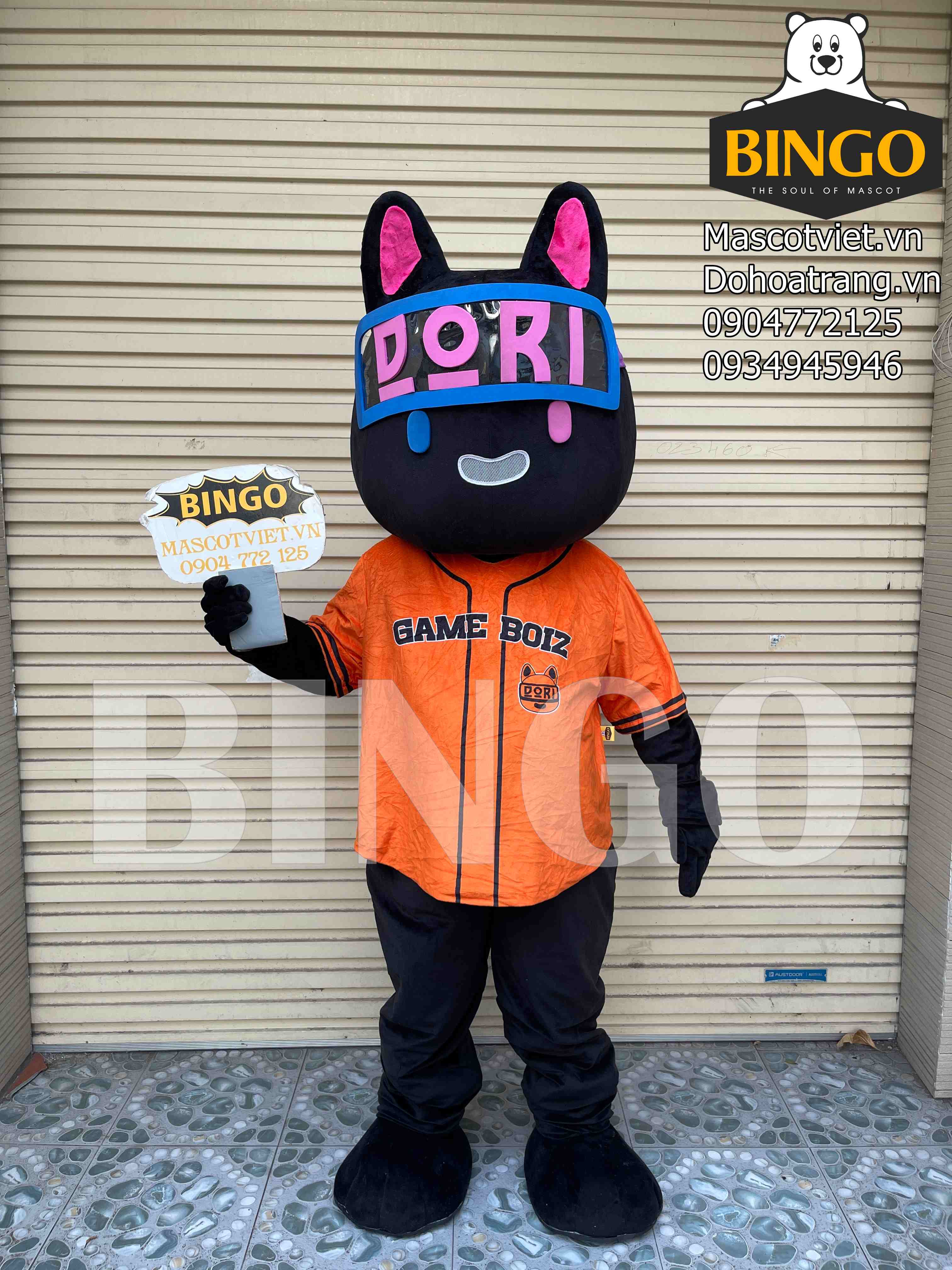 Mèo Dori mascot khoác lên mình chiếc áo cộc màu cam, viền đen. Phía trước ngực là dòng chữ Game Dori, phía đằng sau, ở vị trí chính giữa lưng là dòng chữ DORI DORI và logo Dori vô cùng nổi bật, trang trọng.