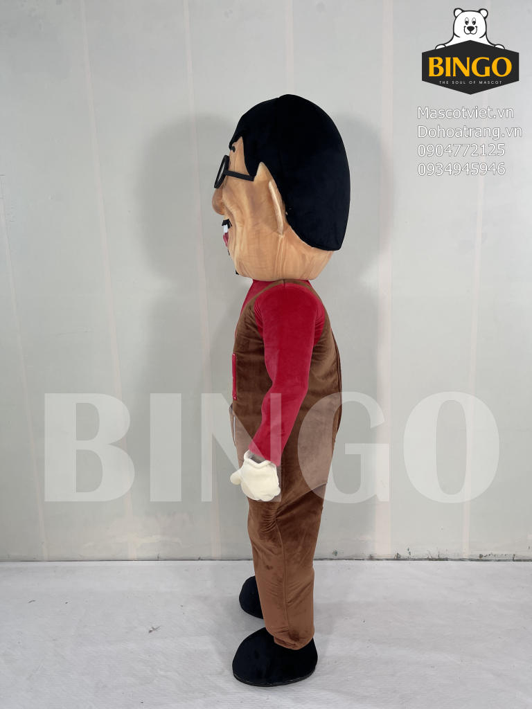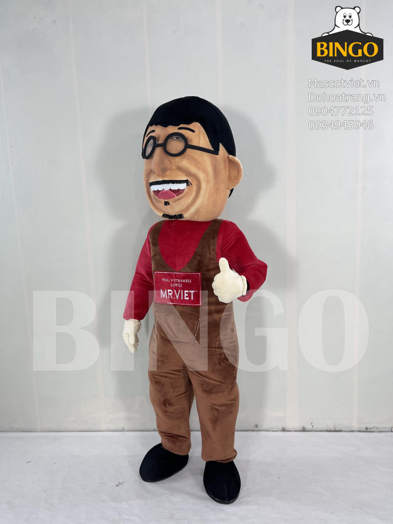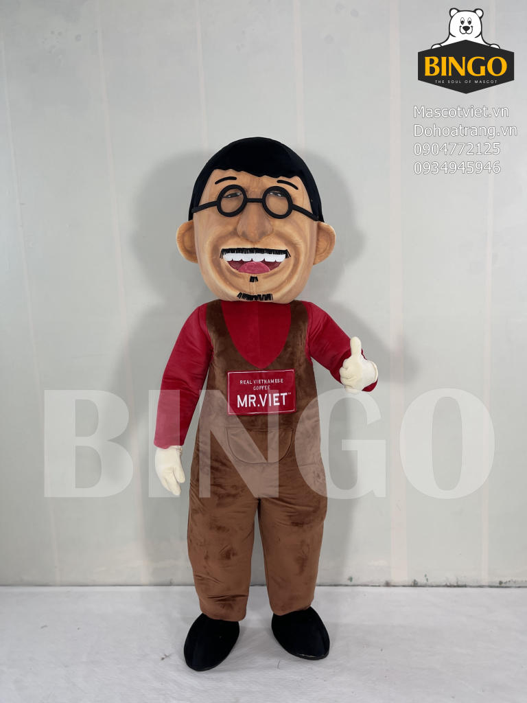 Mascot Mr. Việt là hình tượng nhân vật thương hiệu nổi bật của dòng cà phê Việt, được thiết kế với phong cách dân dã, gần gũi nhưng không kém phần vui nhộn. Với khuôn mặt cười tươi, râu đặc trưng và cặp kính tròn, Mr. Việt mang đến cảm giác thân thiện, dễ nhớ cho khách hàng. Trang phục nâu đỏ nổi bật in logo "MR. VIET – Real Vietnamese Coffee" giúp tăng độ nhận diện thương hiệu.