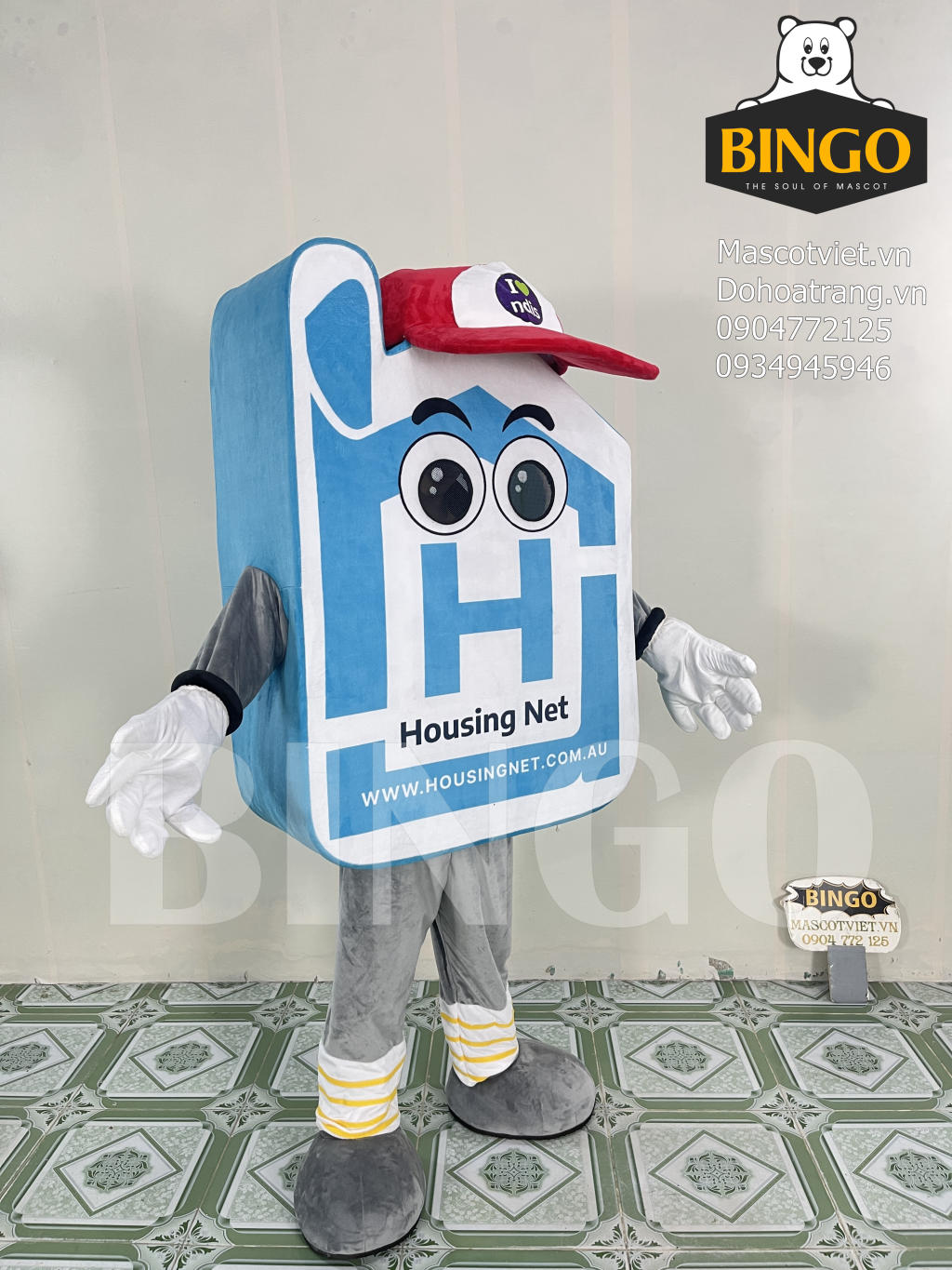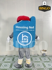 Mascot ngôi nhà Housing Net được thiết kế với tạo hình khối nhà độc đáo, kết hợp gam màu xanh dương và trắng chủ đạo, mang đến cảm giác tin cậy và hiện đại. Điểm nhấn là gương mặt hoạt hình với đôi mắt to tròn và chiếc mũ đỏ nổi bật có dòng chữ “I ♥ NDIS”, giúp mascot trở nên gần gũi và dễ gây thiện cảm. Mặt trước và mặt sau của mascot in rõ thương hiệu Housing Net cùng website www.housingnet.com.au.