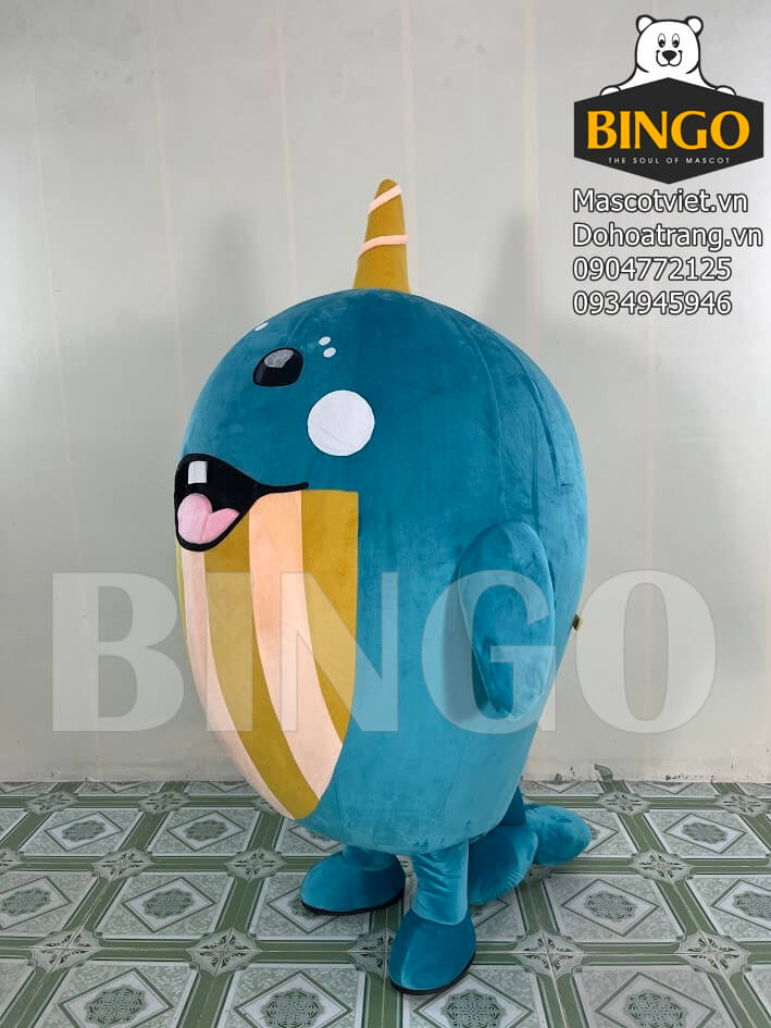 Kỳ lân biển sừng vàng: Thiết kế tròn trịa, màu xanh biển nổi bật, sừng vàng xoắn độc đáo và khuôn mặt đáng yêu với răng cửa trắng, tạo cảm giác vui nhộn, thân thiện.