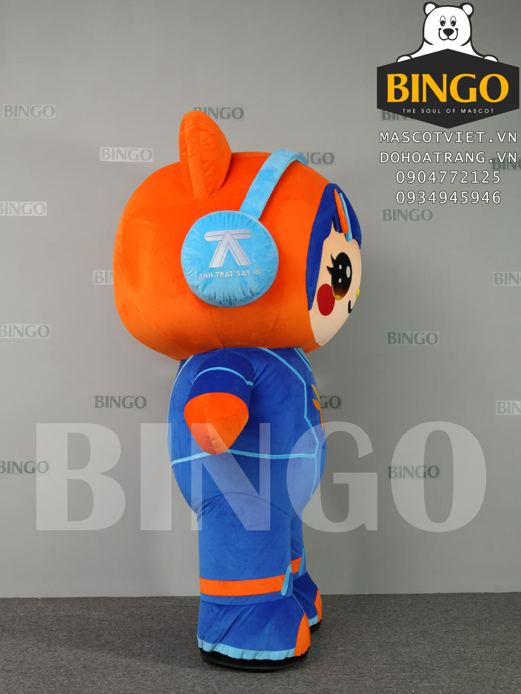 Vị trí Logo: Logo nhãn hàng VIB được in sắc nét tại vị trí chính giữa ngực của mascot. Đặc biệt, và logo Anh Trai "Say Hi" ở bên hông tai nghe.