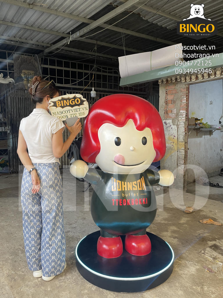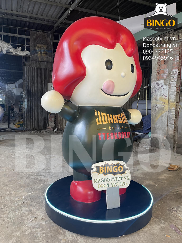 Mô hình mascot Johnson Buffet được chế tác bằng chất liệu composite cao cấp, thiết kế hình nhân vật dễ thương với mái tóc đỏ nổi bật và nụ cười thân thiện. Với chiều cao 1m5, mô hình thu hút ánh nhìn nhờ phong cách tối giản nhưng bắt mắt, màu sắc đậm nét thương hiệu. Đây là điểm check-in lý tưởng cho khách đến nhà hàng, đồng thời giúp tăng nhận diện thương hiệu Johnson Buffet Tteokbokki trong không gian thực tế.