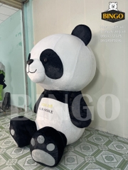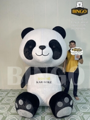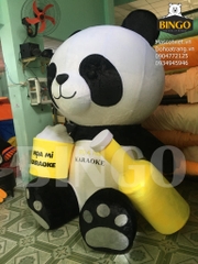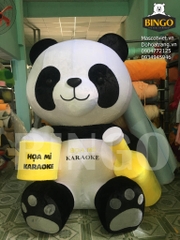 Mô hình gấu trúc bông cao 2m của Karaoke Họa Mi do BINGO sản xuất, với thiết kế dễ thương, tay cầm ly bia vàng in logo “Họa Mi Karaoke”. Chất liệu mềm mại, thu hút khách và tăng nhận diện thương hiệu khi trưng bày tại cửa tiệm.
