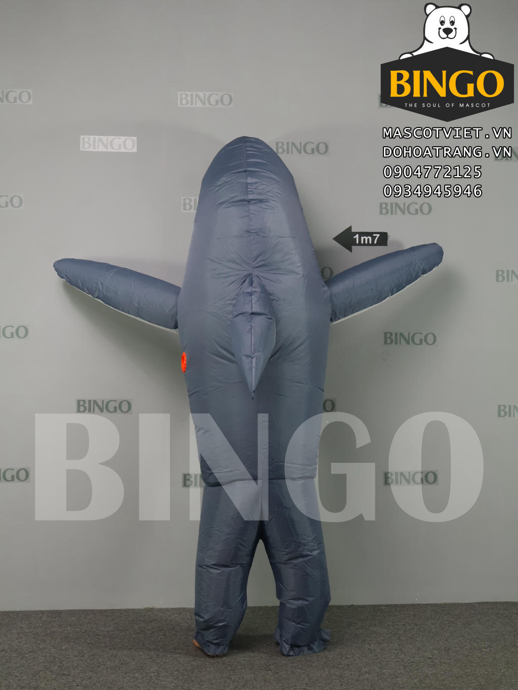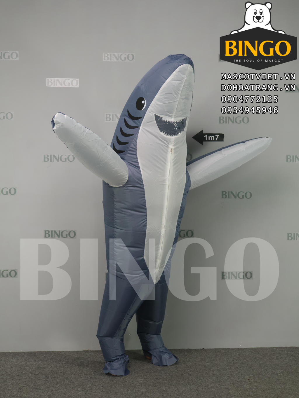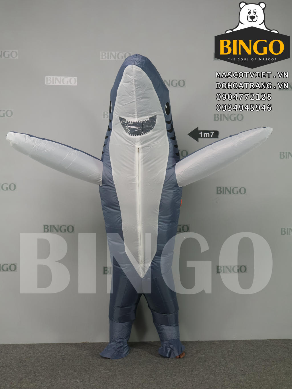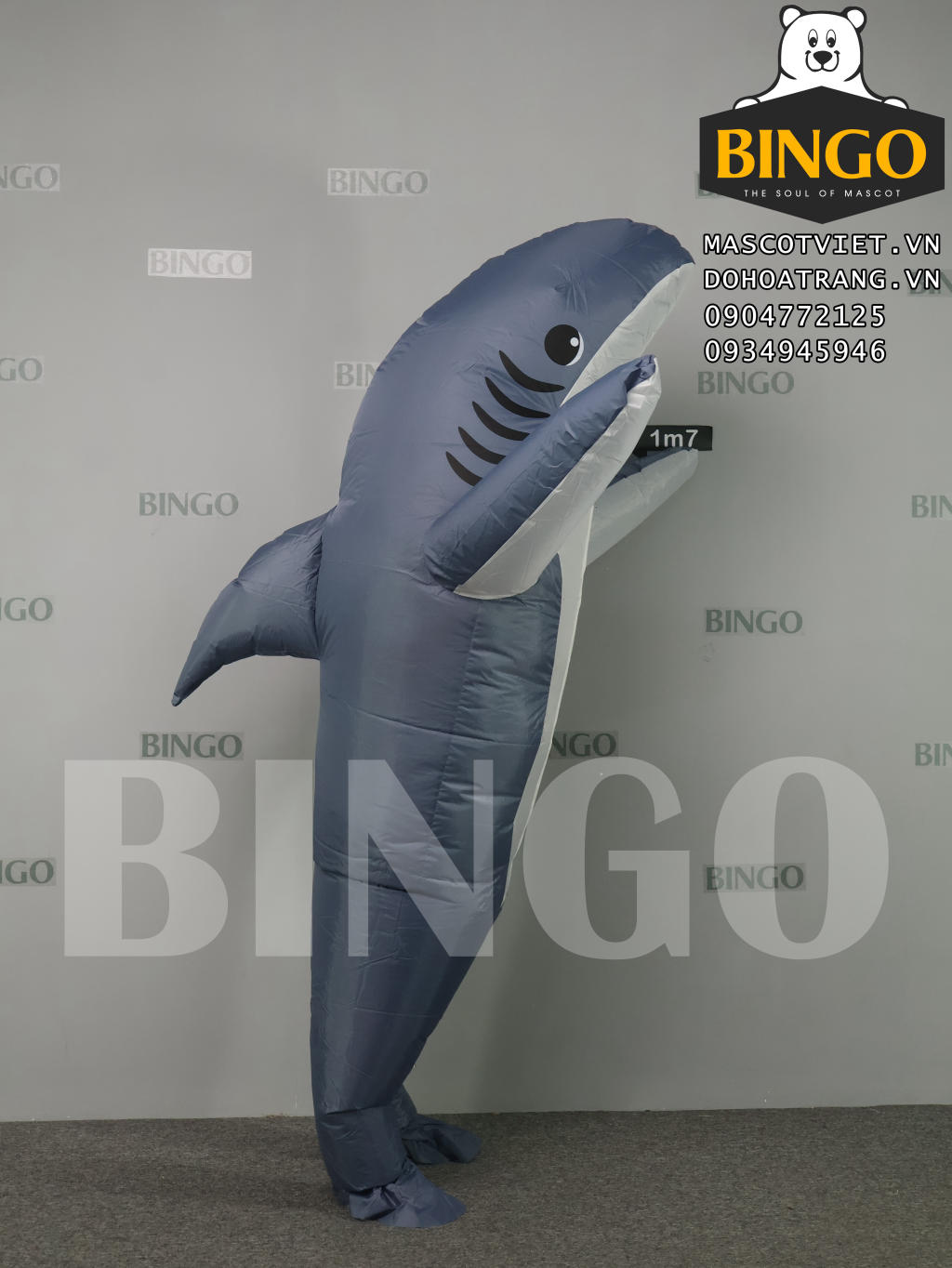 Cũng như các sản phẩm cho thuê khác, mascot hơi cá mập xám được làm cầu tạo từ 1 lớp vải phủ nhựa và đi kèm với quạt thổi mini chạy 4 pin tiểu