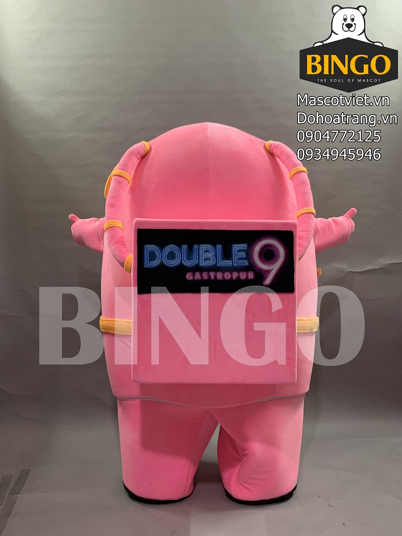 Mascot among hồng Double 9 có màu hồng chủ đạo đúng như tên gọi của nhân vật. Phía trước là cái miệng rộng màu xanh, phía sau mascot đeo hộp vuông nhỏ. Mascot có tên gọi rõ ràng Double 9 nhận diện cả phía trước và sau của nhân vật.