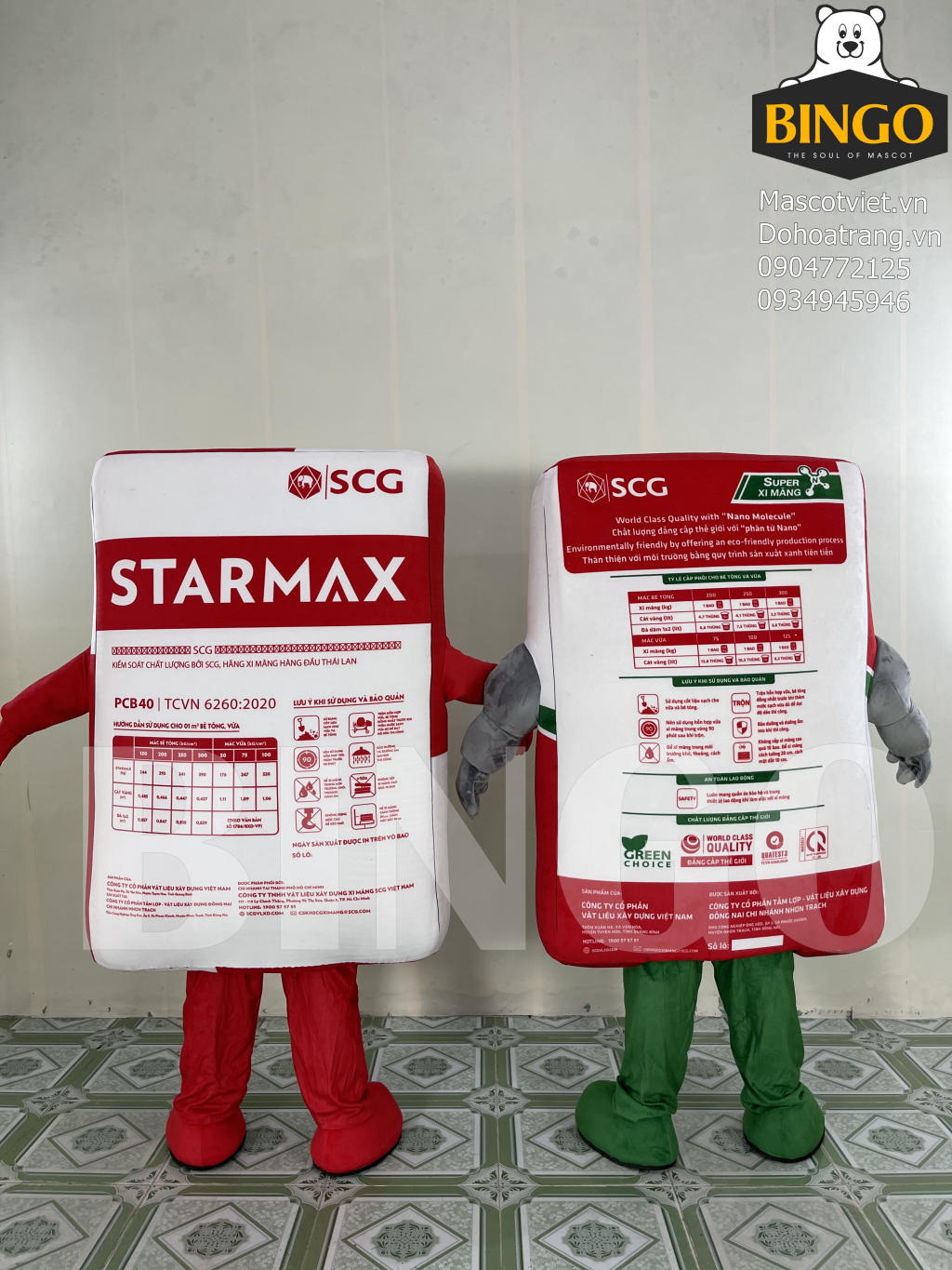Mascot bao xi măng SCG là sản phẩm quảng bá thương hiệu độc đáo do Công ty BINGO thiết kế và sản xuất. Mẫu mascot được mô phỏng theo bao xi măng thật của SCG, với hai phiên bản nổi bật: SCG STARMAX tông đỏ – trắng mạnh mẽ và SCG Low Carbon tông đỏ – xanh thân thiện môi trường.