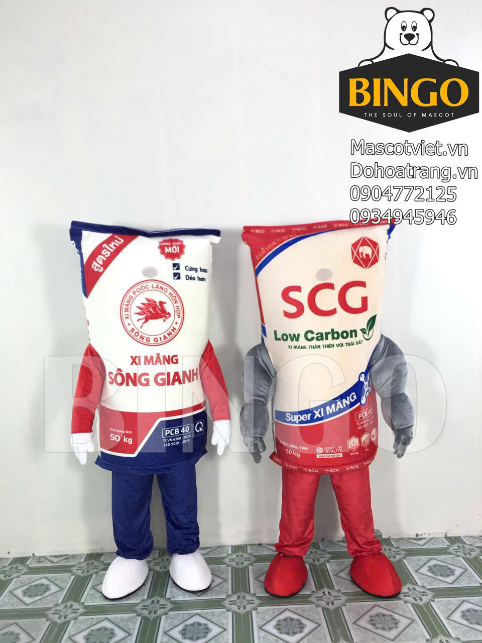Mascot Bao Xi Măng SCG là một cặp linh vật sáng tạo và ấn tượng mô phỏng hình dáng bao bì sản phẩm xi măng của các thương hiệu hàng đầu SCG và Sông Gianh. Mascot được thiết kế tỉ mỉ tái hiện gần như hoàn hảo các chi tiết trên bao bì như logo thông tin kỹ thuật tiêu chuẩn chất lượng và khối lượng 50kg. Mascot SCG nổi bật với tông màu trắng đỏ cùng dòng chữ lớn "SCG Low Carbon" và "Super Xi Măng" nhấn mạnh cam kết về chất lượng và bảo vệ môi trường.