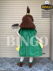 Phần thân mascot là trang phục chiến binh với tông màu xanh và vàng là chính. Vì đây là nhân vật truyện tranh, nhân vật hoạt hình giành cho trẻ nhỏ nên màu sắc nhân vật được lựa chọn tông màu sáng, nổi bật. Phần tay và chân thì là gam màu nude, trùng với màu da càng làm nổi bật bộ trang phục của nhân vật. Chất liệu của trang phục là những loại vải cao cấp, chuyên dụng như vải velbo, foam,… vừa có độ mềm mại lại thấm hút tốt giúp người mặc thoải mái, không bí nóng và dễ dàng vận động.