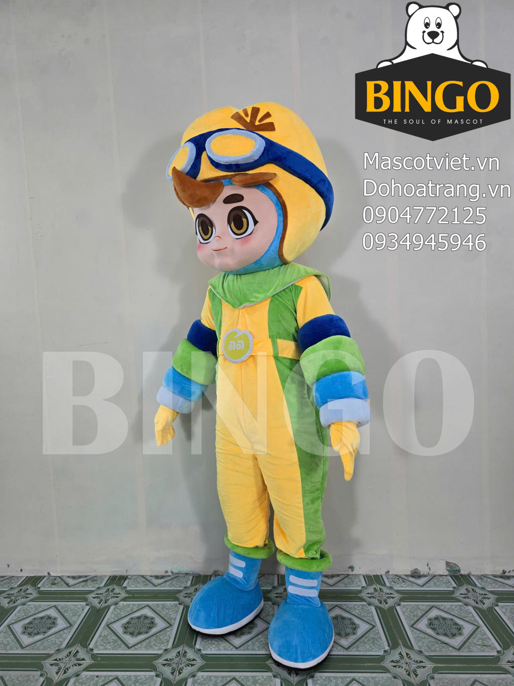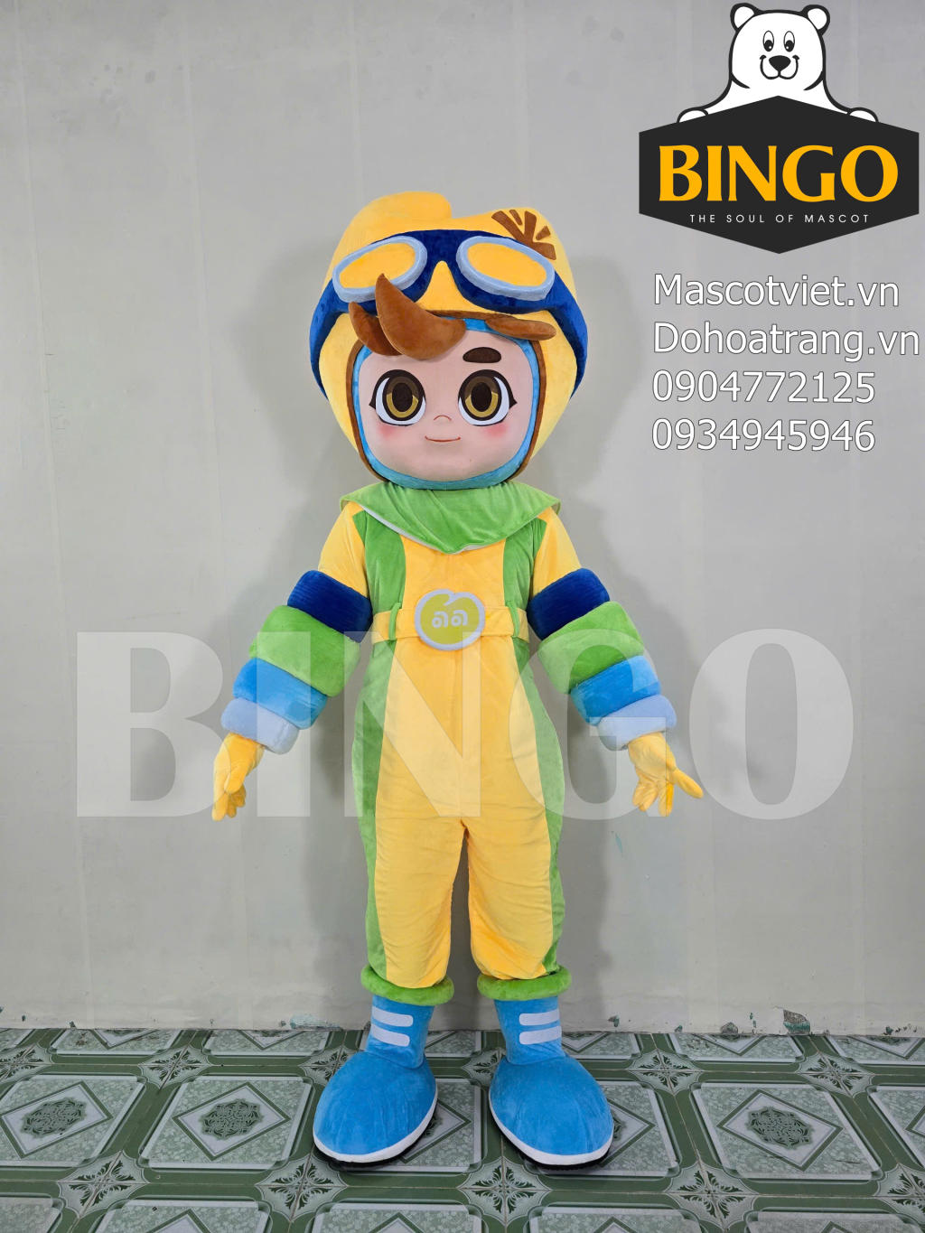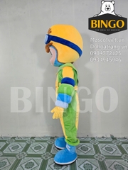 Mascot Bé Nắng là một thiết kế mascot đầy màu sắc và năng động mô phỏng hình ảnh cậu bé phi công dũng cảm sẵn sàng khám phá thế giới. Linh vật này nổi bật với bộ trang phục phi hành gia hoặc phi công kết hợp các tông màu tươi sáng như vàng chanh xanh lá cây và xanh dương tạo cảm giác vui tươi khỏe khoắn. Phần đầu mascot được thiết kế hình tròn với mũ bảo hiểm màu vàng và kính phi công màu xanh đậm tạo điểm nhấn độc đáo và cá tính. Khuôn mặt cậu bé được thể hiện một cách đáng yêu với đôi mắt to tròn long lanh và nụ cười rạng rỡ mang đến sự thân thiện và dễ mến.