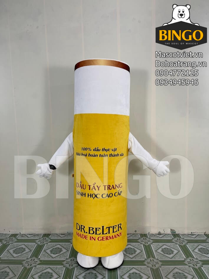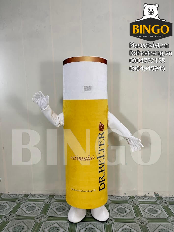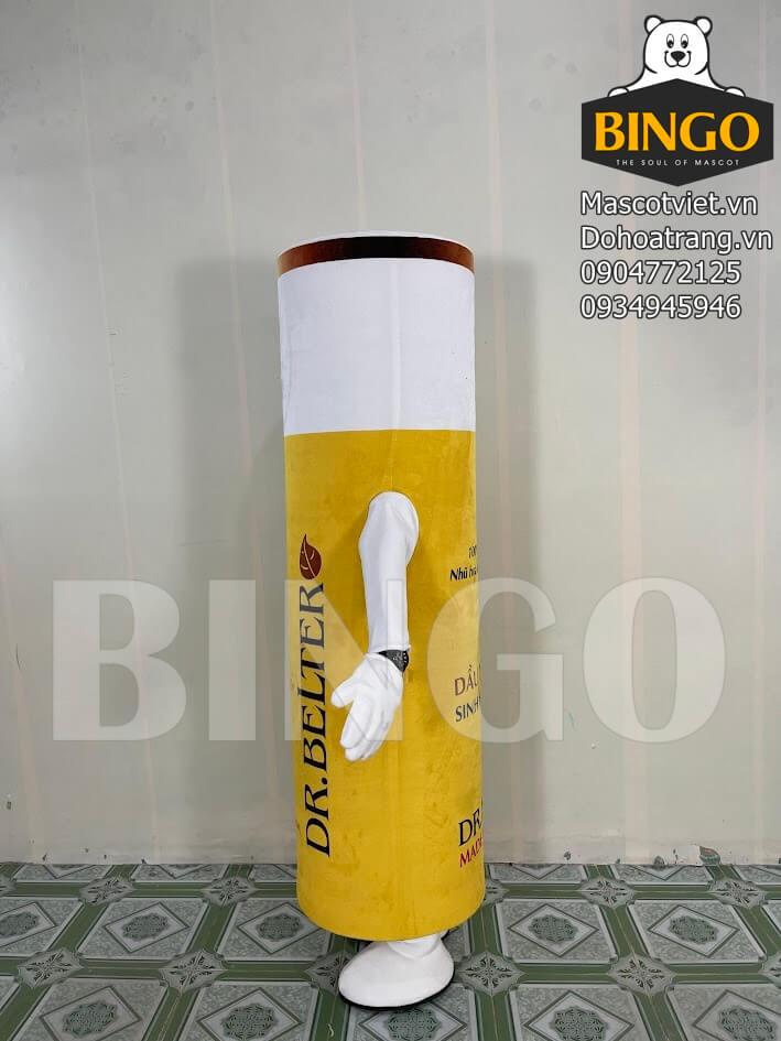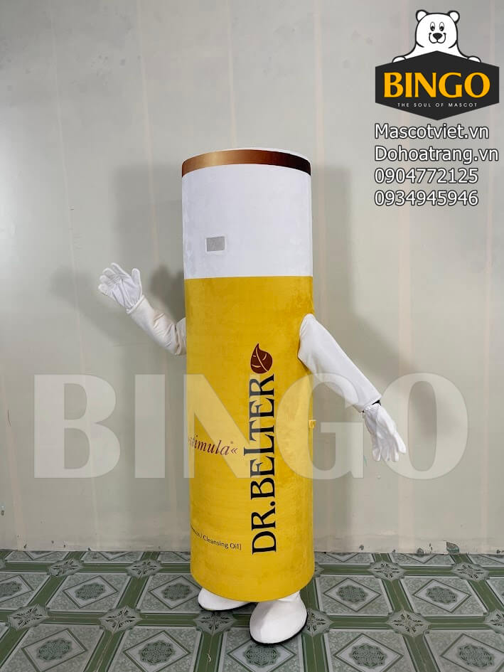 Mascot chai Dr. Belter là mẫu mascot quảng bá sản phẩm cực kỳ nổi bật, được thiết kế dựa trên hình dáng chai dầu tẩy trang sinh học cao cấp của thương hiệu Dr. Belter. Với tông màu vàng trắng sang trọng, mascot giúp khách hàng dễ dàng nhận diện thương hiệu ngay từ xa. Phần thân mascot thể hiện đầy đủ thông tin sản phẩm như tên thương hiệu, công dụng và thông điệp nổi bật, tạo hiệu ứng quảng cáo mạnh mẽ ở mọi sự kiện.