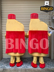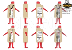 Phần trên của mascot là chieecs nắp màu đỏ với những sọc trắng thẳng đừng, cổ chai tạo hình lệch, với phía dưới hình chữ nhật đừng.