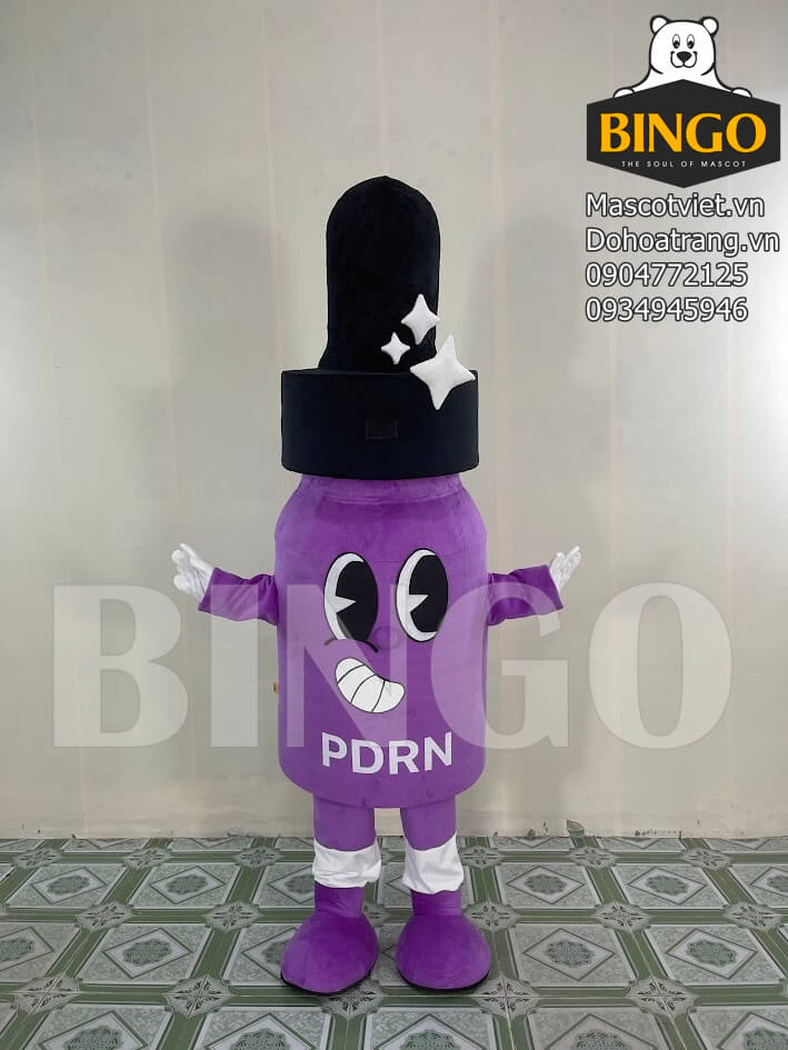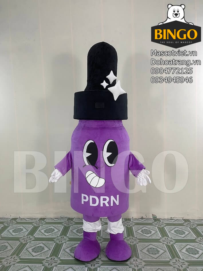 Mascot chai PDRN là thiết kế độc đáo do Công ty BINGO thực hiện, lấy cảm hứng từ lọ tinh chất PDRN trong lĩnh vực làm đẹp và chăm sóc da cao cấp. Với tông màu tím nổi bật kết hợp phần nắp đen có họa tiết ngôi sao trắng, mascot mang lại hình ảnh chuyên nghiệp, sang trọng nhưng vẫn thân thiện và dễ gần. Chất liệu vải nhung cao cấp giúp bề mặt mềm mịn, màu sắc bền đẹp và form dáng luôn chuẩn khi di chuyển hoặc chụp ảnh. Gương mặt hoạt hình đáng yêu với đôi mắt long lanh và nụ cười tươi thể hiện sự năng động, giúp thương hiệu dễ dàng thu hút khách hàng tại các sự kiện, hội chợ, hoặc buổi giới thiệu sản phẩm. Mascot chai PDRN không chỉ tăng nhận diện thương hiệu mà còn tạo điểm nhấn sinh động, giúp khách hàng ghi nhớ lâu hơn về hình ảnh sản phẩm. Đây là lựa chọn lý tưởng cho các doanh nghiệp trong ngành mỹ phẩm, spa, thẩm mỹ viện muốn truyền tải thông điệp về sự chuyên nghiệp, sáng tạo và thân thiện.