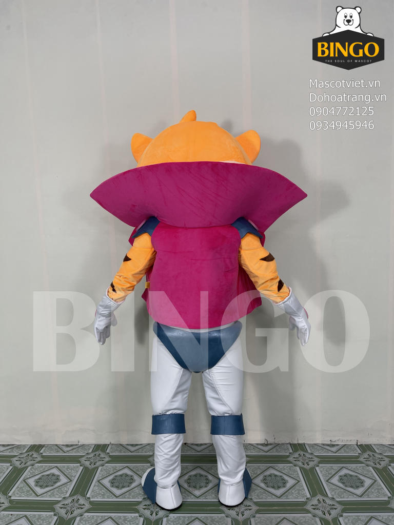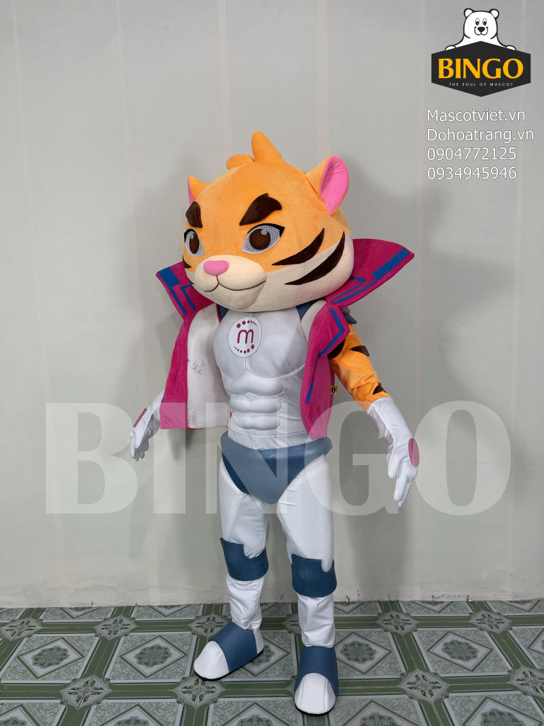 Mascot Cọp M nổi bật với tạo hình cơ bắp mạnh mẽ, bộ đồ trắng-xanh hiện đại cùng áo khoác hồng phá cách. Gương mặt sắc sảo, tai hồng đáng yêu và phong thái siêu anh hùng tạo nên hình tượng cuốn hút, năng động lý tưởng cho sự kiện, quảng bá thương hiệu trẻ trung.