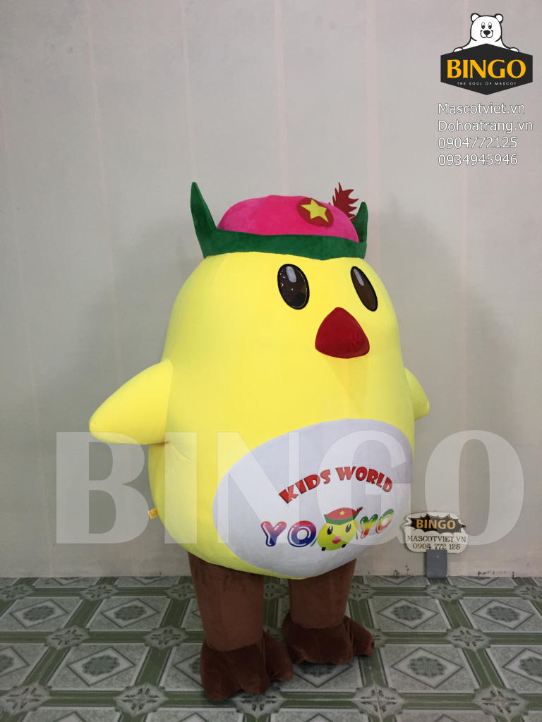 Mascot Gà con YoYo – biểu tượng đáng yêu của Kids World. Với sắc vàng nổi bật, đôi mắt to tròn long lanh và chiếc mũ hồng sao vàng, YoYo mang tinh thần vui tươi, hiếu động. Thiết kế phù hợp cho các chương trình thiếu nhi, sự kiện trường học và khu vui chơi.