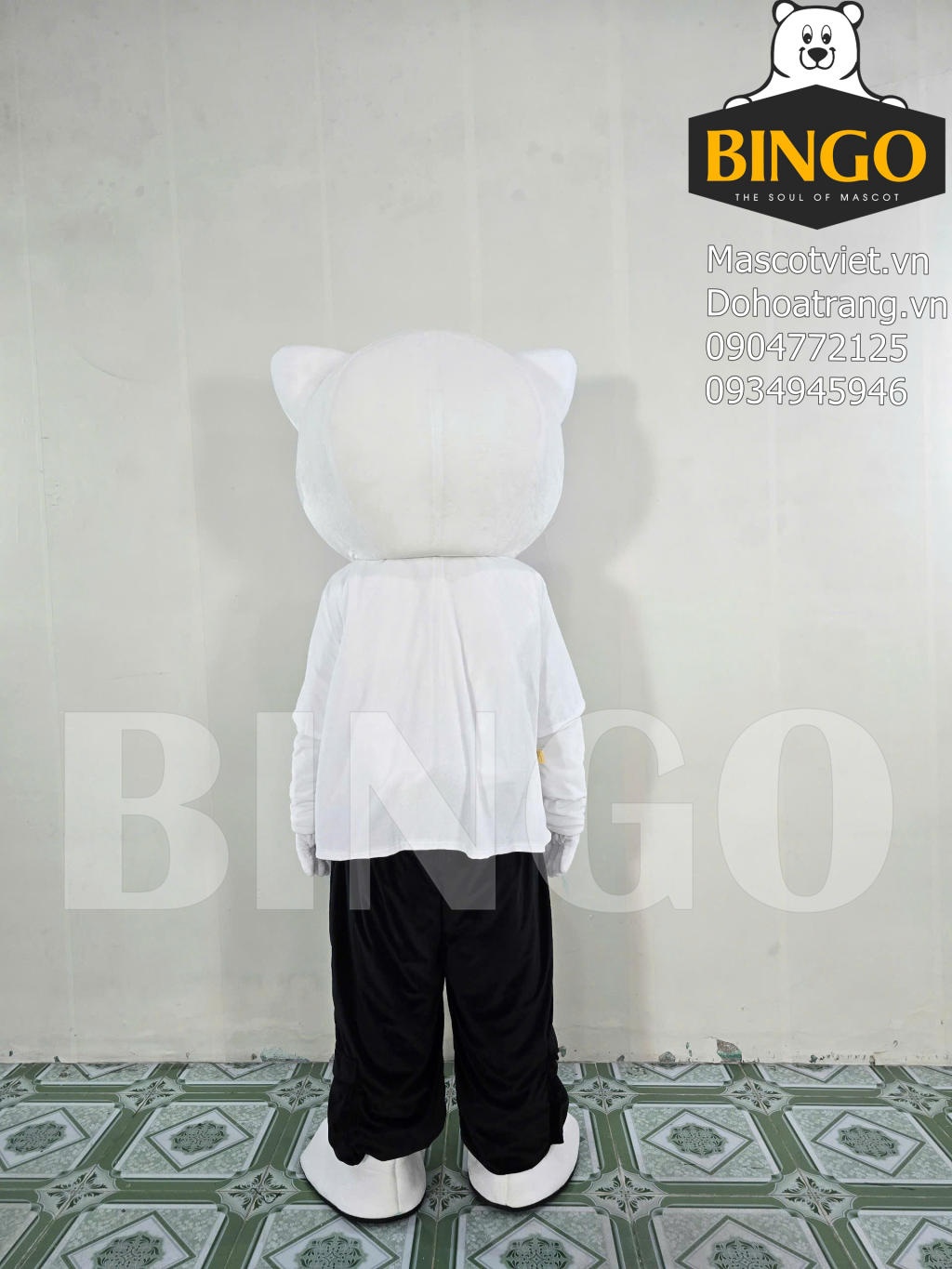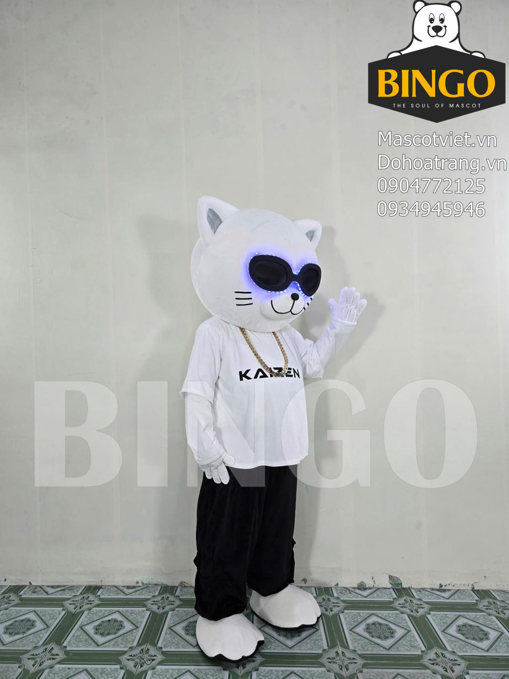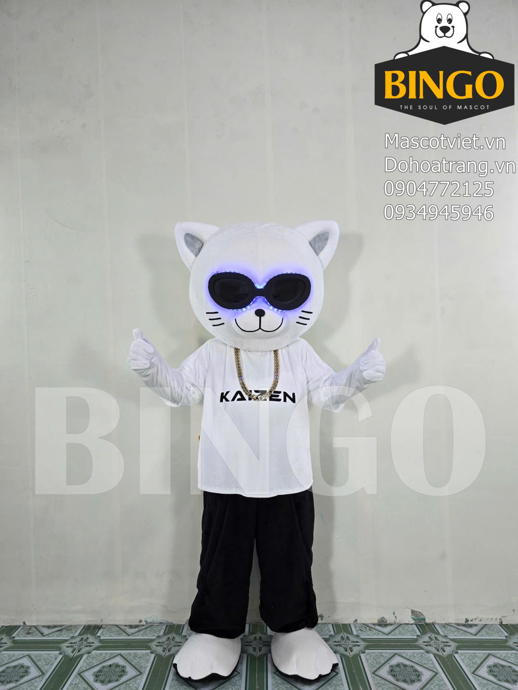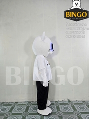 Tạo hình cá tính: Mascot mang hình dáng mèo/gấu trắng dễ thương nhưng được phối đồ cực kỳ "cool ngầu" với áo phông trắng in logo Kaizen và quần đen.