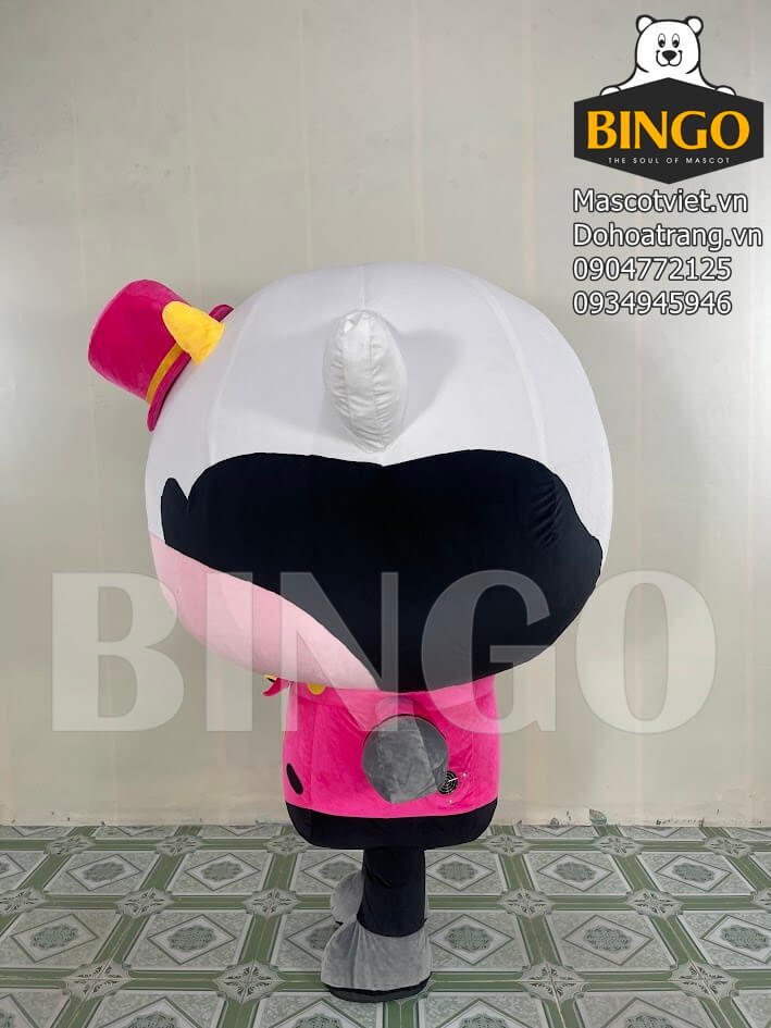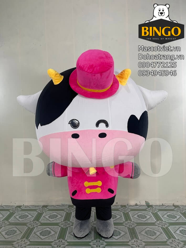 Điểm nhấn làm nên sự độc đáo của Mascot là bộ trang phục phong cách châu Âu kết hợp với chiếc mũ chóp cao màu hồng rực rỡ và đôi sừng vàng nhỏ. Trang phục màu hồng nổi bật, có chuông vàng trên cổ, tạo nên hình ảnh một chú bò sữa vui tính, lịch thiệp và cực kỳ thu hút. Thiết kế hơi (inflatable) giúp linh vật có kích thước ấn tượng, di chuyển linh hoạt và tạo hiệu ứng thị giác mạnh mẽ trong không gian giải trí.