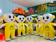 Mascot hơi cậu bé mô phỏng hình ảnh một bé trai dễ thương với trang phục màu vàng nổi bật. Trước ngực của sản phẩm còn in logo của trung tâm tiệc cưới cùng chữ “Thiên đường Wedding” giúp tăng độ nhận diện thương hiệu.