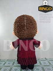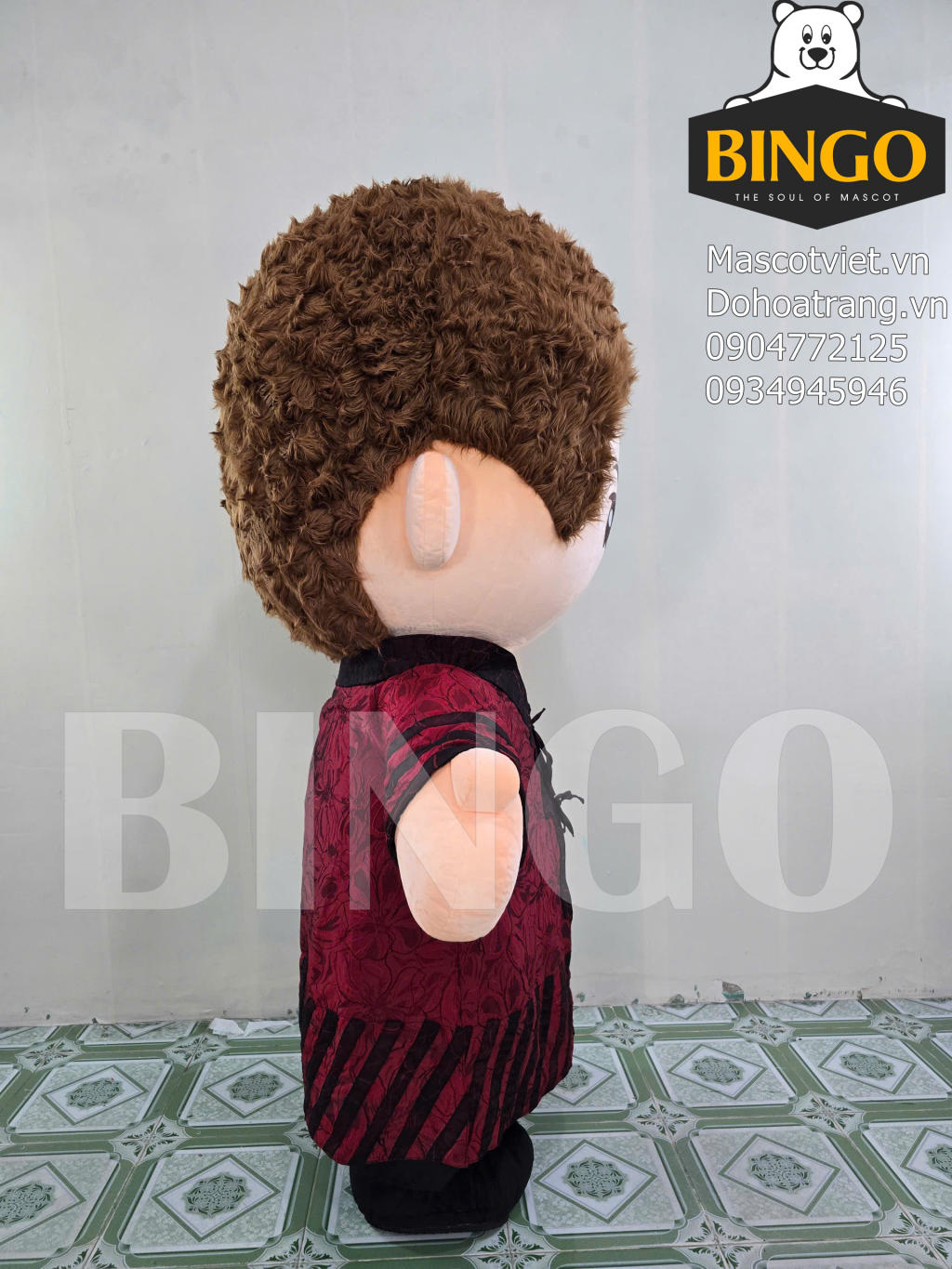Khuôn mặt mascot được làm bầu bĩnh, làn da màu be sáng, với các chi tiết được thêu hoặc in rõ nét. Điểm nhấn là mái tóc xù, xoăn bồng bềnh màu nâu đậm, tạo nên vẻ ngoài lãng tử. Đôi mắt to tròn, đen láy cùng lông mày thanh mảnh tạo ánh nhìn tươi vui, và một nụ cười mỉm duyên dáng. Mascot còn được trang bị khuyên tai bạc nhỏ ở vành tai, thể hiện sự cá tính và thời trang.